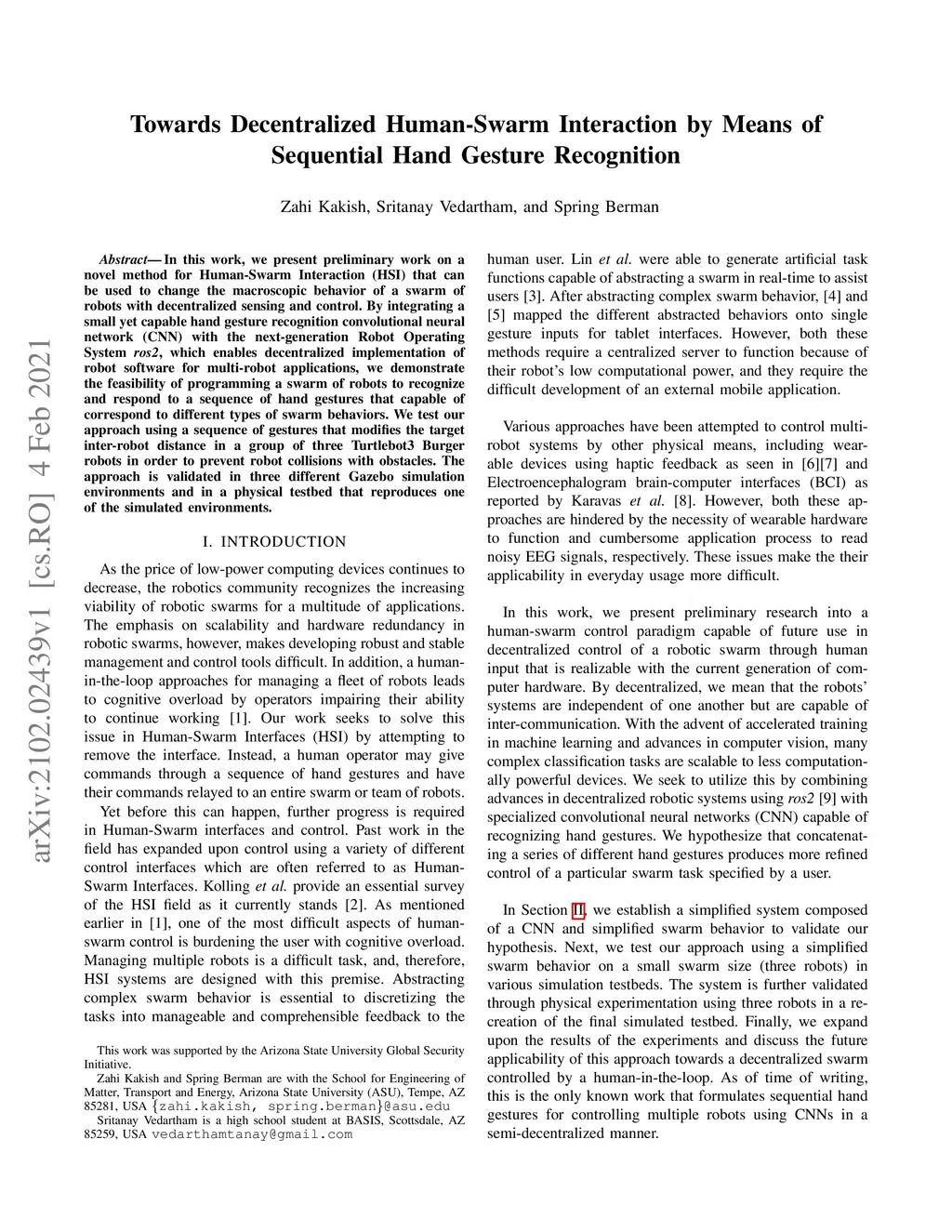 In this work, we present preliminary work on a novel method for Human-Swarm Interaction (HSI) that can be used to change the macroscopic behavior of a swarm of robots with decentralized sensing and control. By integrating a small yet capable hand gesture recognition convolutional neural network (CNN) with the next-generation Robot Operating System \emph{ros2}, which enables decentralized implementation of robot software for multi-robot applications, we demonstrate the feasibility of programming a swarm of robots to recognize and respond to a sequence of hand gestures that capable of correspond to different types of swarm behaviors. We test our approach using a sequence of gestures that modifies the target inter-robot distance in a group of three Turtlebot3 Burger robots in order to prevent robot collisions with obstacles. The approach is validated in three different Gazebo simulation environments and in a physical testbed that reproduces one of the simulated environments.