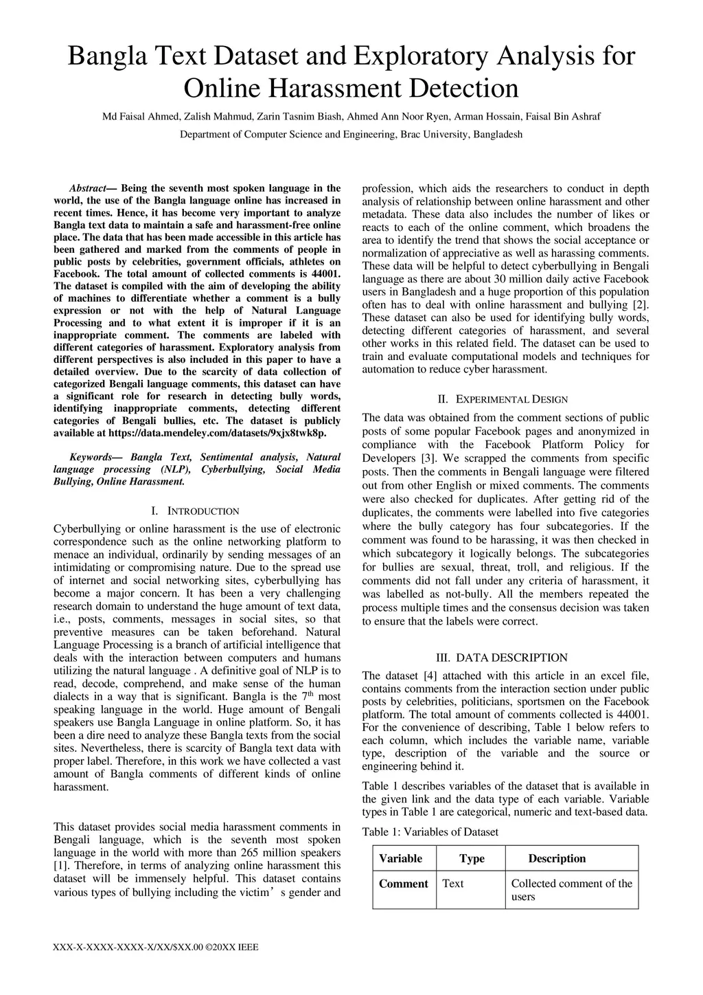 Being the seventh most spoken language in the world, the use of the Bangla language online has increased in recent times. Hence, it has become very important to analyze Bangla text data to maintain a safe and harassment-free online place. The data that has been made accessible in this article has been gathered and marked from the comments of people in public posts by celebrities, government officials, athletes on Facebook. The total amount of collected comments is 44001. The dataset is compiled with the aim of developing the ability of machines to differentiate whether a comment is a bully expression or not with the help of Natural Language Processing and to what extent it is improper if it is an inappropriate comment. The comments are labeled with different categories of harassment. Exploratory analysis from different perspectives is also included in this paper to have a detailed overview. Due to the scarcity of data collection of categorized Bengali language comments, this dataset can have a significant role for research in detecting bully words, identifying inappropriate comments, detecting different categories of Bengali bullies, etc. The dataset is publicly available at https://data.mendeley.com/datasets/9xjx8twk8p.