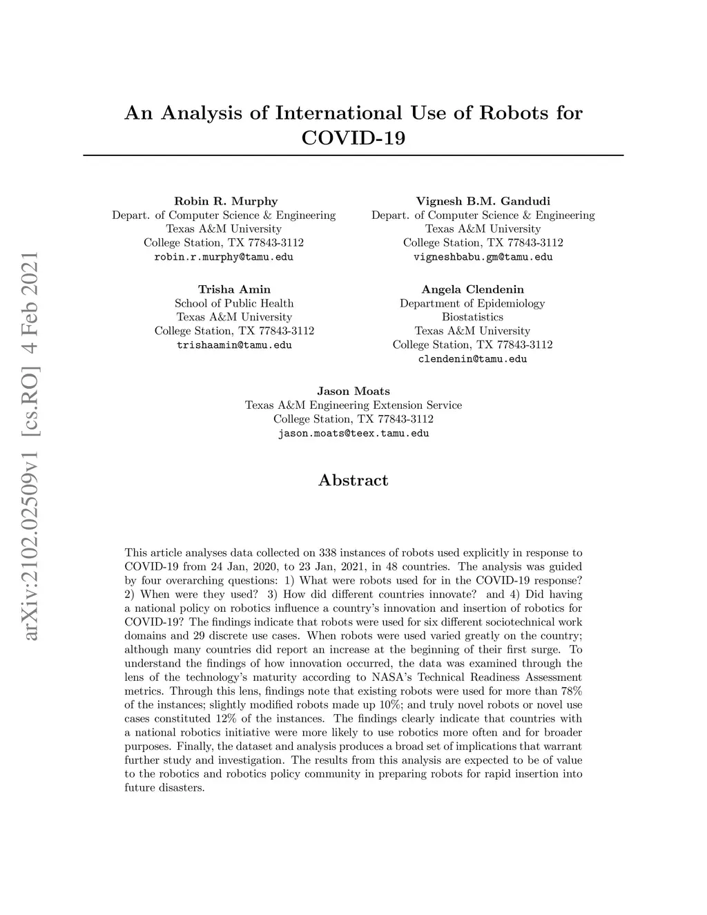 This article analyses data collected on 338 instances of robots used explicitly in response to COVID-19 from 24 Jan, 2020, to 23 Jan, 2021, in 48 countries. The analysis was guided by four overarching questions: 1) What were robots used for in the COVID-19 response? 2) When were they used? 3) How did different countries innovate? and 4) Did having a national policy on robotics influence a country's innovation and insertion of robotics for COVID-19? The findings indicate that robots were used for six different sociotechnical work domains and 29 discrete use cases. When robots were used varied greatly on the country; although many countries did report an increase at the beginning of their first surge. To understand the findings of how innovation occurred, the data was examined through the lens of the technology's maturity according to NASA's Technical Readiness Assessment metrics. Through this lens, findings note that existing robots were used for more than 78% of the instances; slightly modified robots made up 10%; and truly novel robots or novel use cases constituted 12% of the instances. The findings clearly indicate that countries with a national robotics initiative were more likely to use robotics more often and for broader purposes. Finally, the dataset and analysis produces a broad set of implications that warrant further study and investigation. The results from this analysis are expected to be of value to the robotics and robotics policy community in preparing robots for rapid insertion into future disasters.