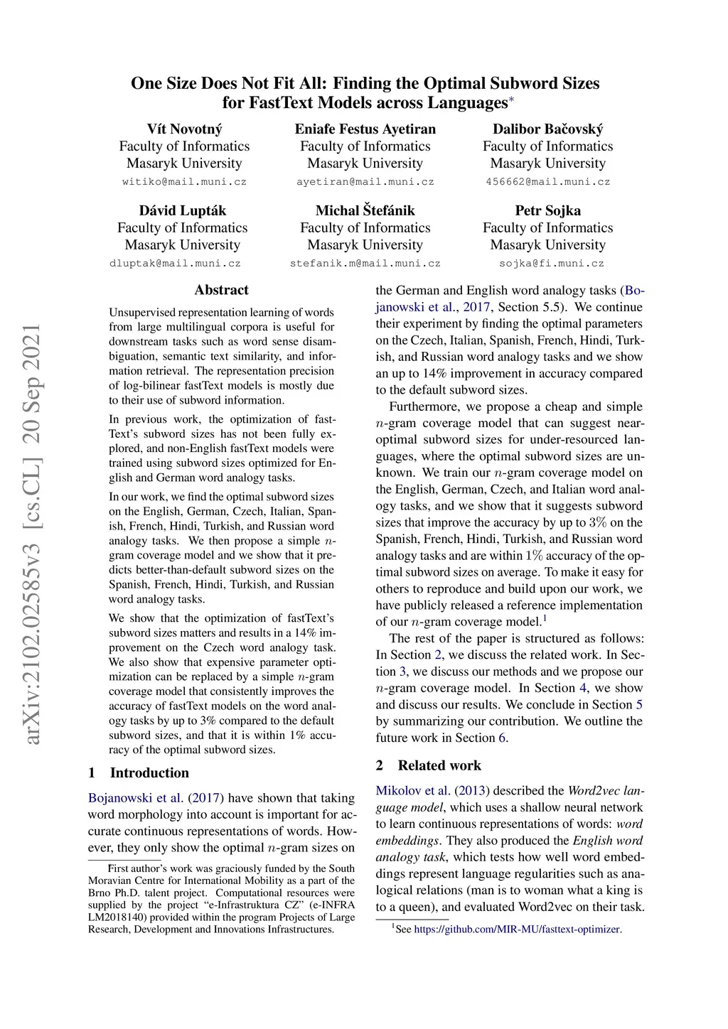 Unsupervised representation learning of words from large multilingual corpora is useful for downstream tasks such as word sense disambiguation, semantic text similarity, and information retrieval. The representation precision of log-bilinear fastText models is mostly due to their use of subword information. In previous work, the optimization of fastText's subword sizes has not been fully explored, and non-English fastText models were trained using subword sizes optimized for English and German word analogy tasks. In our work, we find the optimal subword sizes on the English, German, Czech, Italian, Spanish, French, Hindi, Turkish, and Russian word analogy tasks. We then propose a simple n-gram coverage model and we show that it predicts better-than-default subword sizes on the Spanish, French, Hindi, Turkish, and Russian word analogy tasks. We show that the optimization of fastText's subword sizes matters and results in a 14% improvement on the Czech word analogy task. We also show that expensive parameter optimization can be replaced by a simple n-gram coverage model that consistently improves the accuracy of fastText models on the word analogy tasks by up to 3% compared to the default subword sizes, and that it is within 1% accuracy of the optimal subword sizes.