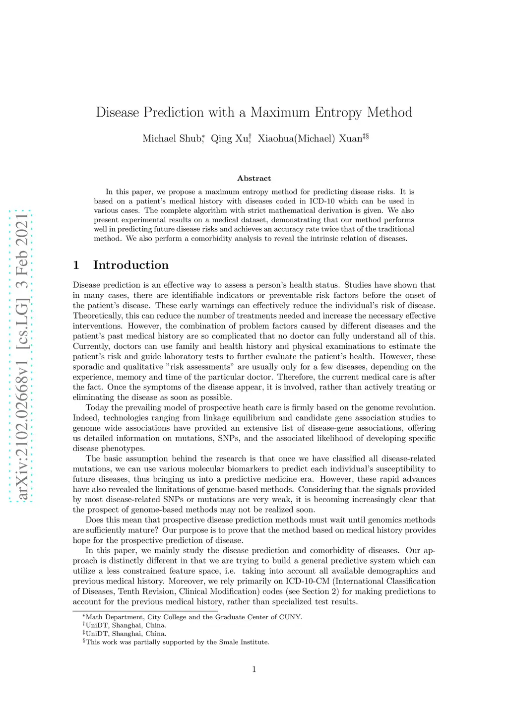 In this paper, we propose a maximum entropy method for predicting disease risks. It is based on a patient's medical history with diseases coded in ICD-10 which can be used in various cases. The complete algorithm with strict mathematical derivation is given. We also present experimental results on a medical dataset, demonstrating that our method performs well in predicting future disease risks and achieves an accuracy rate twice that of the traditional method. We also perform a comorbidity analysis to reveal the intrinsic relation of diseases.