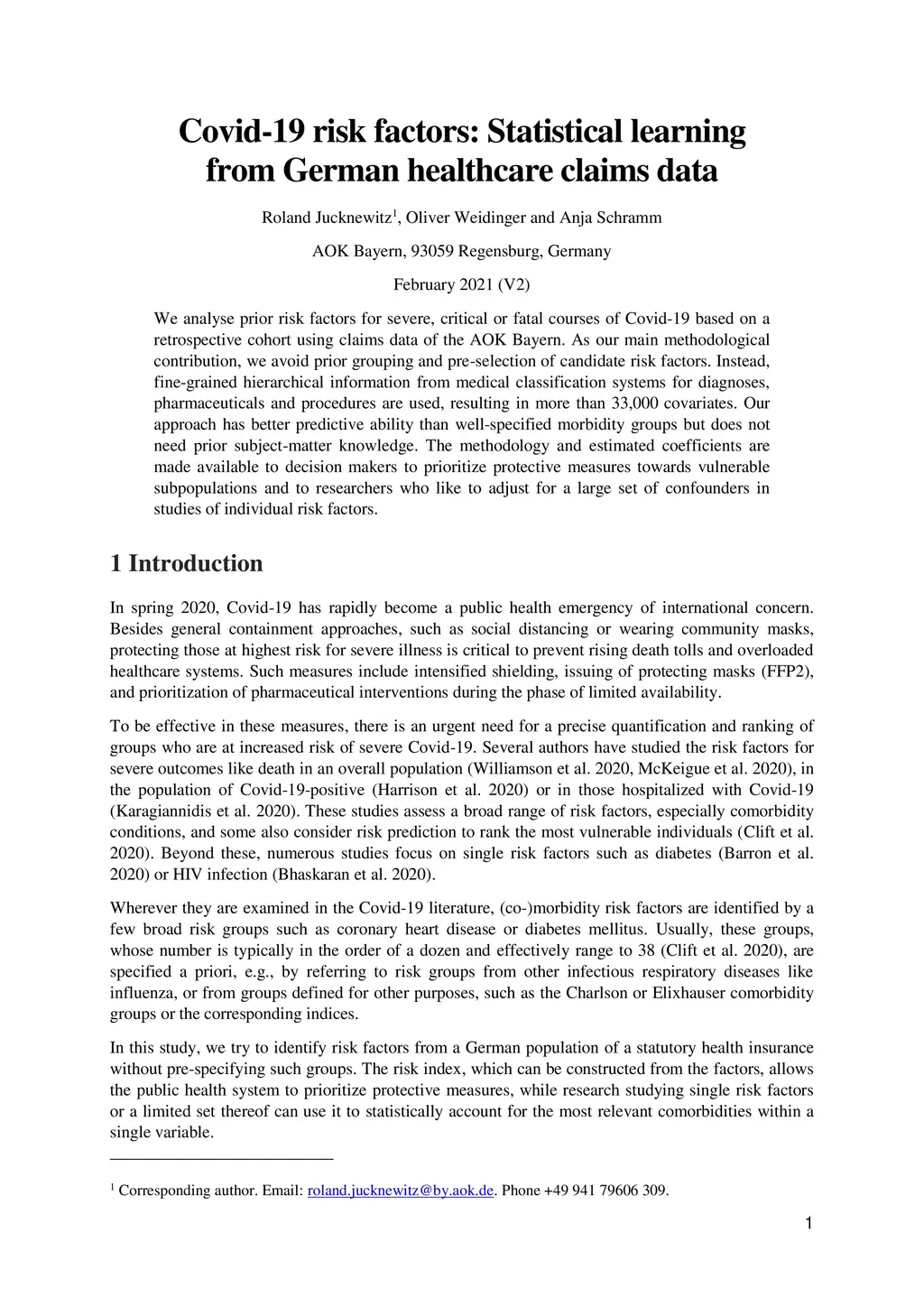 We analyse prior risk factors for severe, critical or fatal courses of Covid-19 based on a retrospective cohort using claims data of the AOK Bayern. As our main methodological contribution, we avoid prior grouping and pre-selection of candidate risk factors. Instead, fine-grained hierarchical information from medical classification systems for diagnoses, pharmaceuticals and procedures are used, resulting in more than 33,000 covariates. Our approach has better predictive ability than well-specified morbidity groups but does not need prior subject-matter knowledge. The methodology and estimated coefficients are made available to decision makers to prioritize protective measures towards vulnerable subpopulations and to researchers who like to adjust for a large set of confounders in studies of individual risk factors.