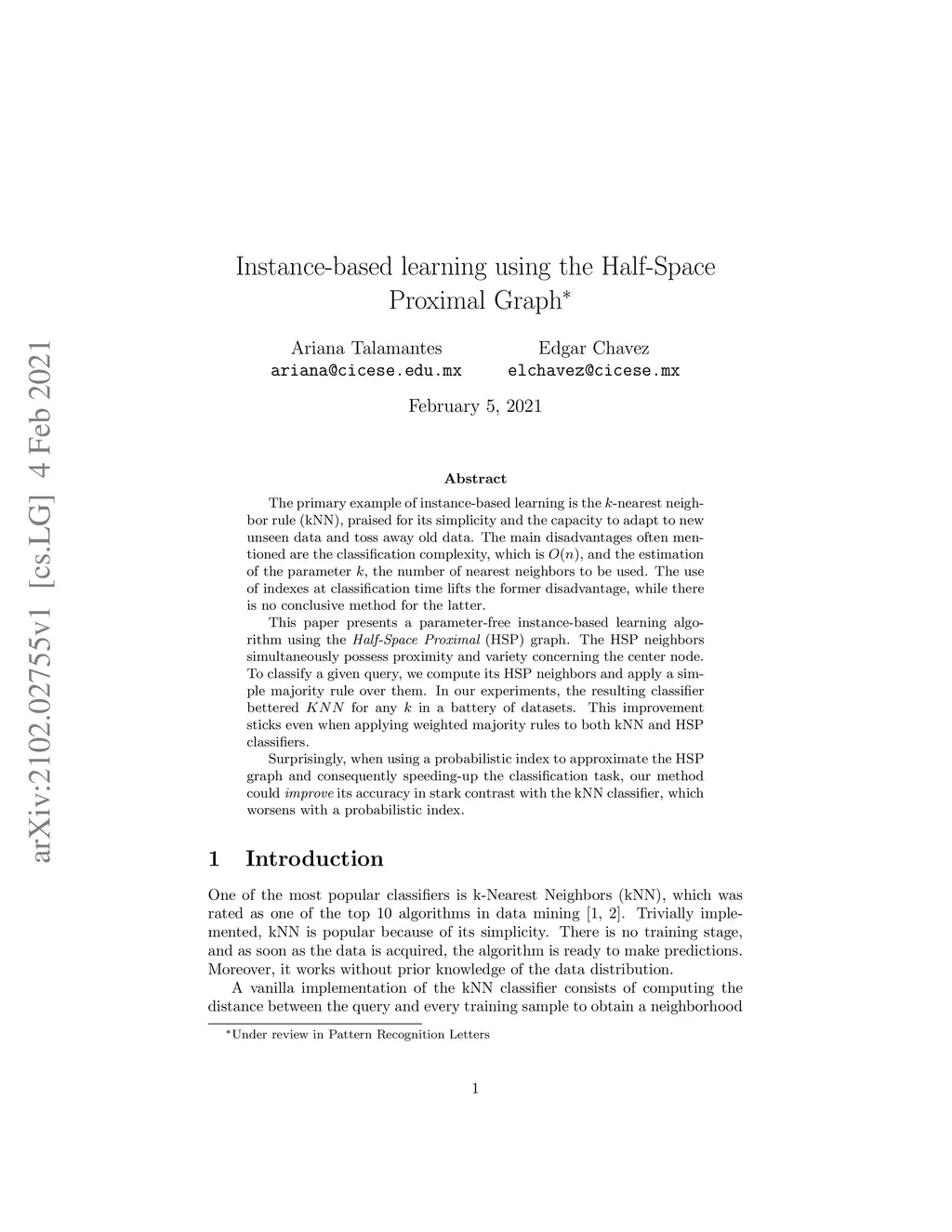 The primary example of instance-based learning is the -nearest neighbor rule (kNN), praised for its simplicity and the capacity to adapt to new unseen data and toss away old data. The main disadvantages often mentioned are the classification complexity, which is , and the estimation of the parameter , the number of nearest neighbors to be used. The use of indexes at classification time lifts the former disadvantage, while there is no conclusive method for the latter. This paper presents a parameter-free instance-based learning algorithm using the {\em Half-Space Proximal} (HSP) graph. The HSP neighbors simultaneously possess proximity and variety concerning the center node. To classify a given query, we compute its HSP neighbors and apply a simple majority rule over them. In our experiments, the resulting classifier bettered for any in a battery of datasets. This improvement sticks even when applying weighted majority rules to both kNN and HSP classifiers. Surprisingly, when using a probabilistic index to approximate the HSP graph and consequently speeding-up the classification task, our method could {\em improve} its accuracy in stark contrast with the kNN classifier, which worsens with a probabilistic index.
