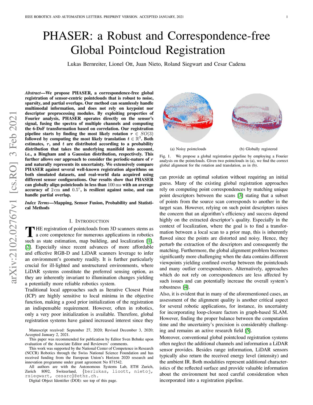 We propose PHASER, a correspondence-free global registration of sensor-centric pointclouds that is robust to noise, sparsity, and partial overlaps. Our method can seamlessly handle multimodal information and does not rely on keypoint nor descriptor preprocessing modules. By exploiting properties of Fourier analysis, PHASER operates directly on the sensor's signal, fusing the spectra of multiple channels and computing the 6-DoF transformation based on correlation. Our registration pipeline starts by finding the most likely rotation followed by computing the most likely translation. Both estimates are distributed according to a probability distribution that takes the underlying manifold into account, i.e., a Bingham and Gaussian distribution, respectively. This further allows our approach to consider the periodic-nature of rotations and naturally represent its uncertainty. We extensively compare PHASER against several well-known registration algorithms on both simulated datasets, and real-world data acquired using different sensor configurations. Our results show that PHASER can globally align pointclouds in less than 100ms with an average accuracy of 2cm and 0.5deg, is resilient against noise, and can handle partial overlap.