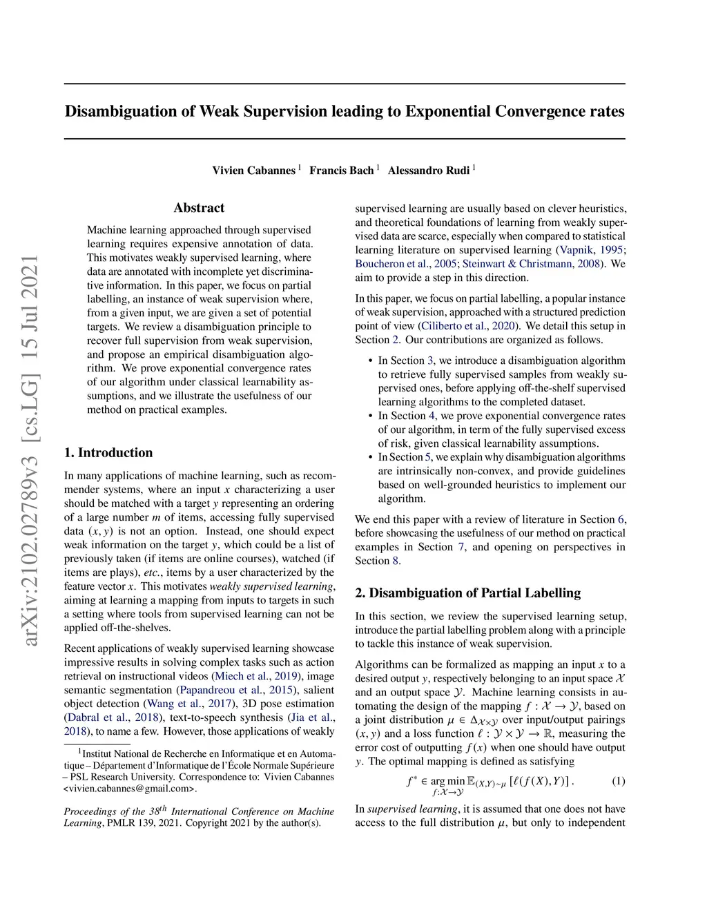 Machine learning approached through supervised learning requires expensive annotation of data. This motivates weakly supervised learning, where data are annotated with incomplete yet discriminative information. In this paper, we focus on partial labelling, an instance of weak supervision where, from a given input, we are given a set of potential targets. We review a disambiguation principle to recover full supervision from weak supervision, and propose an empirical disambiguation algorithm. We prove exponential convergence rates of our algorithm under classical learnability assumptions, and we illustrate the usefulness of our method on practical examples.
