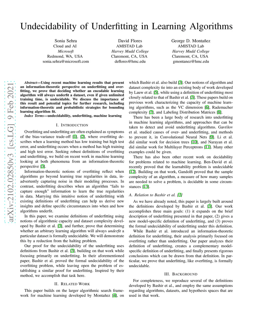 Using recent machine learning results that present an information-theoretic perspective on underfitting and overfitting, we prove that deciding whether an encodable learning algorithm will always underfit a dataset, even if given unlimited training time, is undecidable. We discuss the importance of this result and potential topics for further research, including information-theoretic and probabilistic strategies for bounding learning algorithm fit.