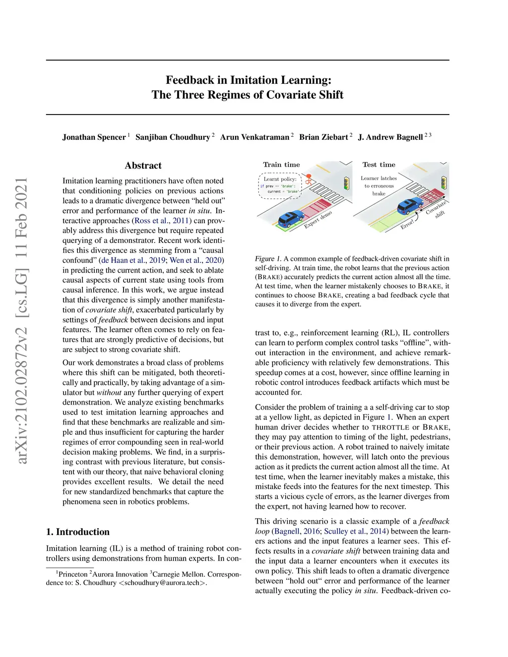 Imitation learning practitioners have often noted that conditioning policies on previous actions leads to a dramatic divergence between "held out" error and performance of the learner in situ. Interactive approaches can provably address this divergence but require repeated querying of a demonstrator. Recent work identifies this divergence as stemming from a "causal confound" in predicting the current action, and seek to ablate causal aspects of current state using tools from causal inference. In this work, we argue instead that this divergence is simply another manifestation of covariate shift, exacerbated particularly by settings of feedback between decisions and input features. The learner often comes to rely on features that are strongly predictive of decisions, but are subject to strong covariate shift. Our work demonstrates a broad class of problems where this shift can be mitigated, both theoretically and practically, by taking advantage of a simulator but without any further querying of expert demonstration. We analyze existing benchmarks used to test imitation learning approaches and find that these benchmarks are realizable and simple and thus insufficient for capturing the harder regimes of error compounding seen in real-world decision making problems. We find, in a surprising contrast with previous literature, but consistent with our theory, that naive behavioral cloning provides excellent results. We detail the need for new standardized benchmarks that capture the phenomena seen in robotics problems.