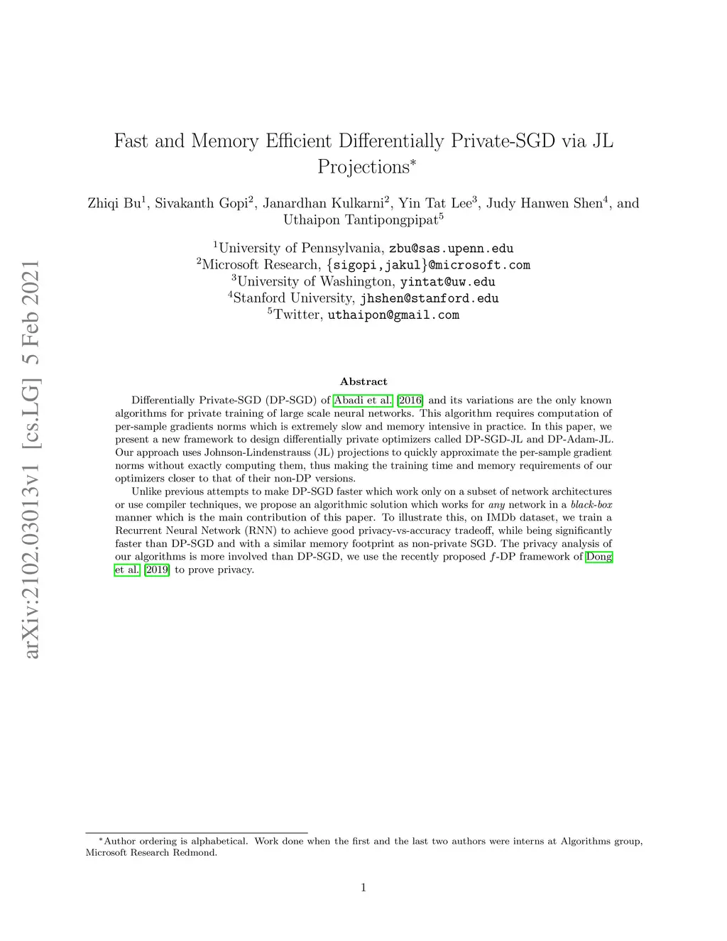 Differentially Private-SGD (DP-SGD) of Abadi et al. (2016) and its variations are the only known algorithms for private training of large scale neural networks. This algorithm requires computation of per-sample gradients norms which is extremely slow and memory intensive in practice. In this paper, we present a new framework to design differentially private optimizers called DP-SGD-JL and DP-Adam-JL. Our approach uses Johnson-Lindenstrauss (JL) projections to quickly approximate the per-sample gradient norms without exactly computing them, thus making the training time and memory requirements of our optimizers closer to that of their non-DP versions. Unlike previous attempts to make DP-SGD faster which work only on a subset of network architectures or use compiler techniques, we propose an algorithmic solution which works for any network in a black-box manner which is the main contribution of this paper. To illustrate this, on IMDb dataset, we train a Recurrent Neural Network (RNN) to achieve good privacy-vs-accuracy tradeoff, while being significantly faster than DP-SGD and with a similar memory footprint as non-private SGD. The privacy analysis of our algorithms is more involved than DP-SGD, we use the recently proposed f-DP framework of Dong et al. (2019) to prove privacy.