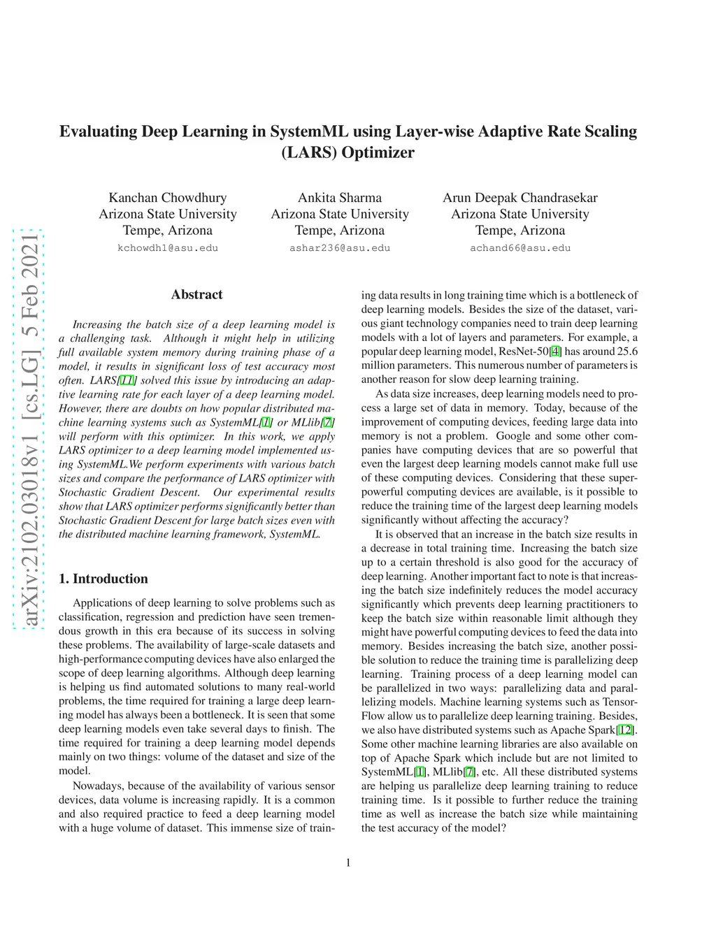 Increasing the batch size of a deep learning model is a challenging task. Although it might help in utilizing full available system memory during training phase of a model, it results in significant loss of test accuracy most often. LARS solved this issue by introducing an adaptive learning rate for each layer of a deep learning model. However, there are doubts on how popular distributed machine learning systems such as SystemML or MLlib will perform with this optimizer. In this work, we apply LARS optimizer to a deep learning model implemented using SystemML.We perform experiments with various batch sizes and compare the performance of LARS optimizer with \textit{Stochastic Gradient Descent}. Our experimental results show that LARS optimizer performs significantly better than Stochastic Gradient Descent for large batch sizes even with the distributed machine learning framework, SystemML.