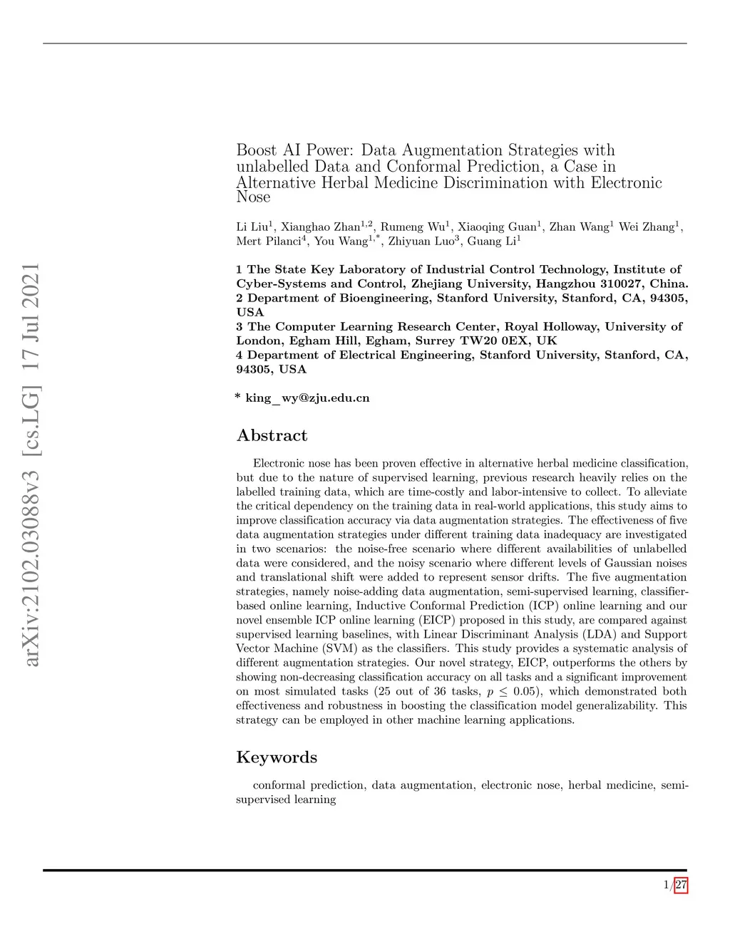 Electronic nose has been proven to be effective in alternative herbal medicine classification, but due to the nature of supervised learning, previous research heavily relies on the labelled training data, which are time-costly and labor-intensive to collect. To alleviate the critical dependency on the training data in real-world applications, this study aims to improve classification accuracy via data augmentation strategies. The effectiveness of five data augmentation strategies under different training data inadequacy are investigated in two scenarios: the noise-free scenario where different availabilities of unlabelled data were considered, and the noisy scenario where different levels of Gaussian noises and translational shifts were added to represent sensor drifts. The five augmentation strategies, namely noise-adding data augmentation, semi-supervised learning, classifier-based online learning, Inductive Conformal Prediction (ICP) online learning and our novel ensemble ICP online learning proposed in this study, are experimented and compared against supervised learning baseline, with Linear Discriminant Analysis (LDA) and Support Vector Machine (SVM) as the classifiers. Our novel strategy, ensemble ICP online learning, outperforms the others by showing non-decreasing classification accuracy on all tasks and a significant improvement on most simulated tasks (25out of 36 tasks,p<=0.05). Furthermore, this study provides a systematic analysis of different augmentation strategies. It shows at least one strategy significantly improved the classification accuracy with LDA (p<=0.05) and non-decreasing classification accuracy with SVM in each task. In particular, our proposed strategy demonstrated both effectiveness and robustness in boosting the classification model generalizability, which can be employed in other machine learning applications.