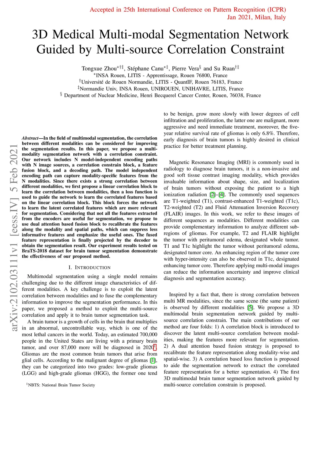 In the field of multimodal segmentation, the correlation between different modalities can be considered for improving the segmentation results. In this paper, we propose a multi-modality segmentation network with a correlation constraint. Our network includes N model-independent encoding paths with N image sources, a correlation constraint block, a feature fusion block, and a decoding path. The model independent encoding path can capture modality-specific features from the N modalities. Since there exists a strong correlation between different modalities, we first propose a linear correlation block to learn the correlation between modalities, then a loss function is used to guide the network to learn the correlated features based on the linear correlation block. This block forces the network to learn the latent correlated features which are more relevant for segmentation. Considering that not all the features extracted from the encoders are useful for segmentation, we propose to use dual attention based fusion block to recalibrate the features along the modality and spatial paths, which can suppress less informative features and emphasize the useful ones. The fused feature representation is finally projected by the decoder to obtain the segmentation result. Our experiment results tested on BraTS-2018 dataset for brain tumor segmentation demonstrate the effectiveness of our proposed method.