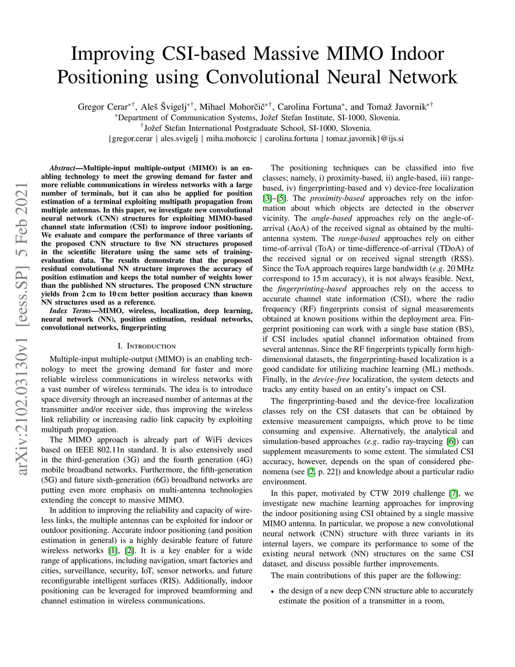 Multiple-input multiple-output (MIMO) is an enabling technology to meet the growing demand for faster and more reliable communications in wireless networks with a large number of terminals, but it can also be applied for position estimation of a terminal exploiting multipath propagation from multiple antennas. In this paper, we investigate new convolutional neural network (CNN) structures for exploiting MIMO-based channel state information (CSI) to improve indoor positioning. We evaluate and compare the performance of three variants of the proposed CNN structure to five NN structures proposed in the scientific literature using the same sets of training-evaluation data. The results demonstrate that the proposed residual convolutional NN structure improves the accuracy of position estimation and keeps the total number of weights lower than the published NN structures. The proposed CNN structure yields from 2cm to 10cm better position accuracy than known NN structures used as a reference.