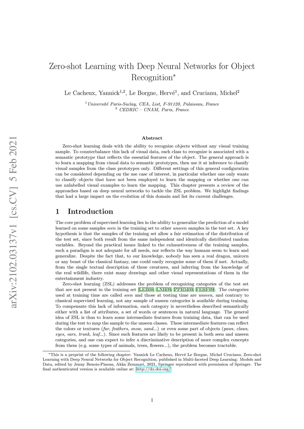 Zero-shot learning deals with the ability to recognize objects without any visual training sample. To counterbalance this lack of visual data, each class to recognize is associated with a semantic prototype that reflects the essential features of the object. The general approach is to learn a mapping from visual data to semantic prototypes, then use it at inference to classify visual samples from the class prototypes only. Different settings of this general configuration can be considered depending on the use case of interest, in particular whether one only wants to classify objects that have not been employed to learn the mapping or whether one can use unlabelled visual examples to learn the mapping. This chapter presents a review of the approaches based on deep neural networks to tackle the ZSL problem. We highlight findings that had a large impact on the evolution of this domain and list its current challenges.
