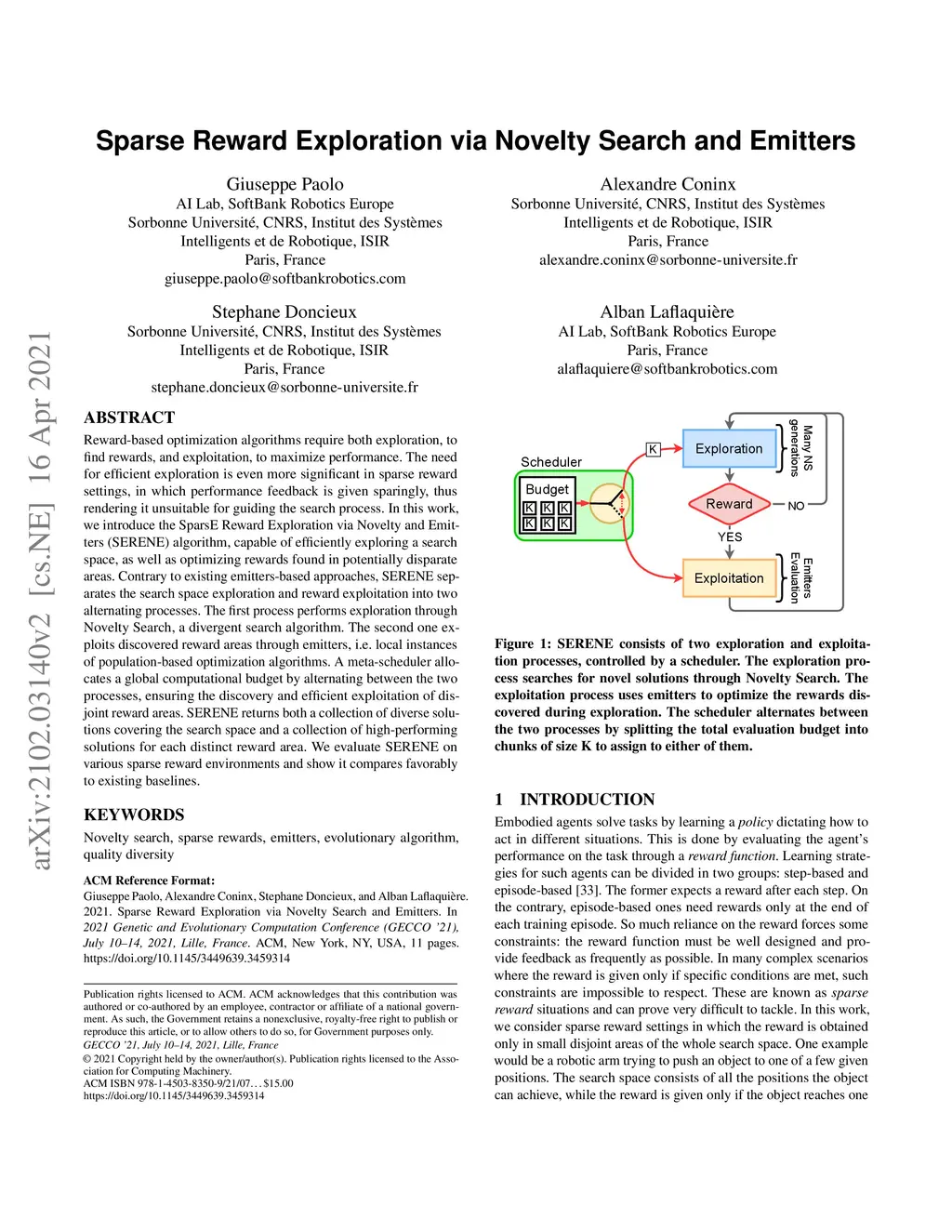 Reward-based optimization algorithms require both exploration, to find rewards, and exploitation, to maximize performance. The need for efficient exploration is even more significant in sparse reward settings, in which performance feedback is given sparingly, thus rendering it unsuitable for guiding the search process. In this work, we introduce the SparsE Reward Exploration via Novelty and Emitters (SERENE) algorithm, capable of efficiently exploring a search space, as well as optimizing rewards found in potentially disparate areas. Contrary to existing emitters-based approaches, SERENE separates the search space exploration and reward exploitation into two alternating processes. The first process performs exploration through Novelty Search, a divergent search algorithm. The second one exploits discovered reward areas through emitters, i.e. local instances of population-based optimization algorithms. A meta-scheduler allocates a global computational budget by alternating between the two processes, ensuring the discovery and efficient exploitation of disjoint reward areas. SERENE returns both a collection of diverse solutions covering the search space and a collection of high-performing solutions for each distinct reward area. We evaluate SERENE on various sparse reward environments and show it compares favorably to existing baselines.