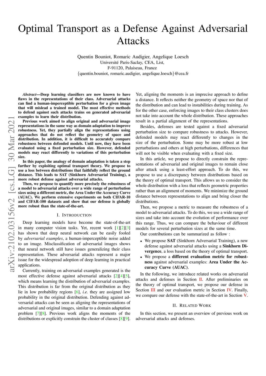Deep learning classifiers are now known to have flaws in the representations of their class. Adversarial attacks can find a human-imperceptible perturbation for a given image that will mislead a trained model. The most effective methods to defend against such attacks trains on generated adversarial examples to learn their distribution. Previous work aimed to align original and adversarial image representations in the same way as domain adaptation to improve robustness. Yet, they partially align the representations using approaches that do not reflect the geometry of space and distribution. In addition, it is difficult to accurately compare robustness between defended models. Until now, they have been evaluated using a fixed perturbation size. However, defended models may react differently to variations of this perturbation size. In this paper, the analogy of domain adaptation is taken a step further by exploiting optimal transport theory. We propose to use a loss between distributions that faithfully reflect the ground distance. This leads to SAT (Sinkhorn Adversarial Training), a more robust defense against adversarial attacks. Then, we propose to quantify more precisely the robustness of a model to adversarial attacks over a wide range of perturbation sizes using a different metric, the Area Under the Accuracy Curve (AUAC). We perform extensive experiments on both CIFAR-10 and CIFAR-100 datasets and show that our defense is globally more robust than the state-of-the-art.