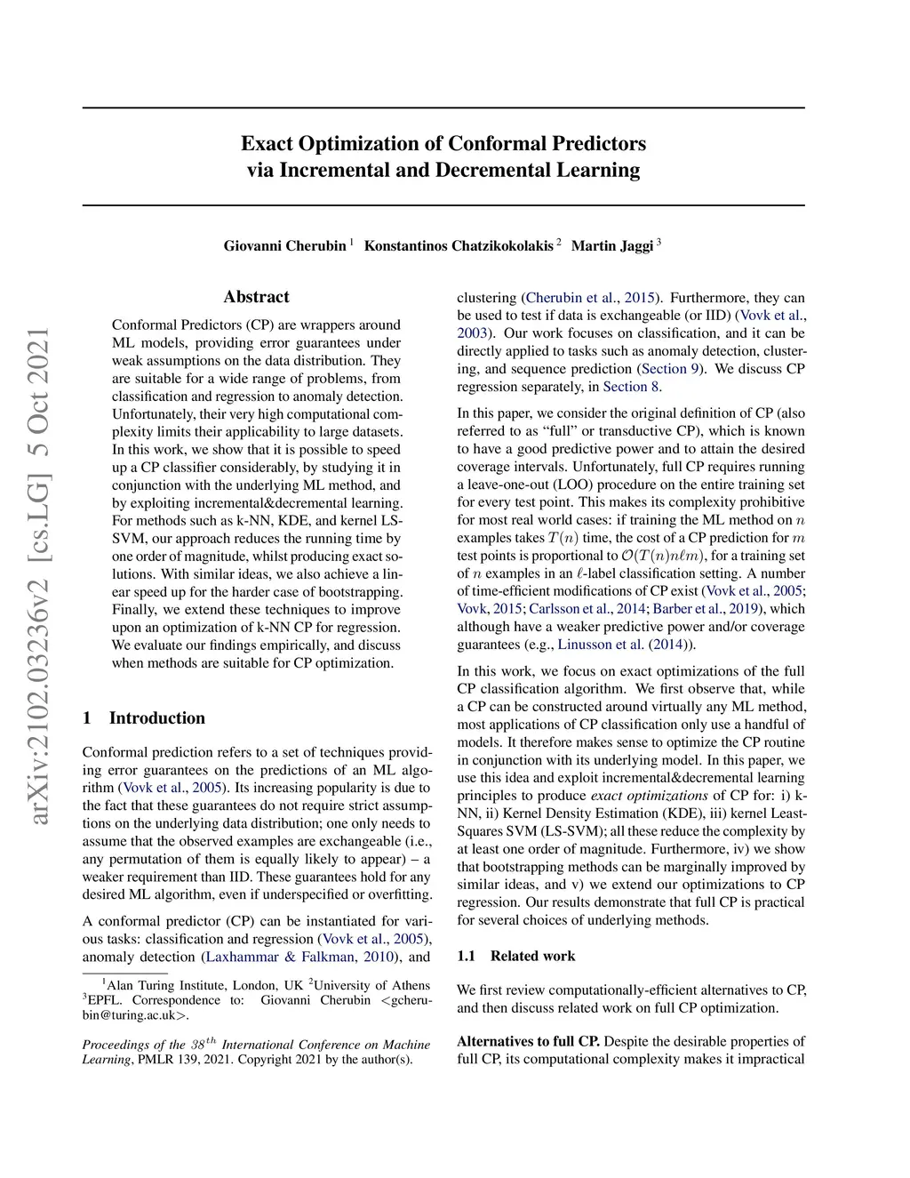 Conformal Predictors (CP) are wrappers around ML models, providing error guarantees under weak assumptions on the data distribution. They are suitable for a wide range of problems, from classification and regression to anomaly detection. Unfortunately, their very high computational complexity limits their applicability to large datasets. In this work, we show that it is possible to speed up a CP classifier considerably, by studying it in conjunction with the underlying ML method, and by exploiting incremental&decremental learning. For methods such as k-NN, KDE, and kernel LS-SVM, our approach reduces the running time by one order of magnitude, whilst producing exact solutions. With similar ideas, we also achieve a linear speed up for the harder case of bootstrapping. Finally, we extend these techniques to improve upon an optimization of k-NN CP for regression. We evaluate our findings empirically, and discuss when methods are suitable for CP optimization.