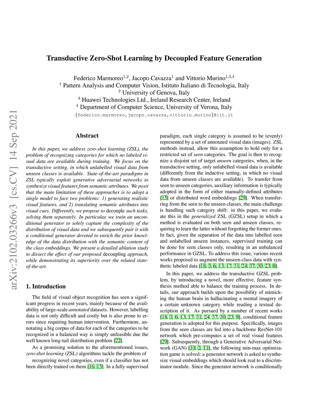 Transductive Zero-Shot Learning by Decoupled Feature Generation