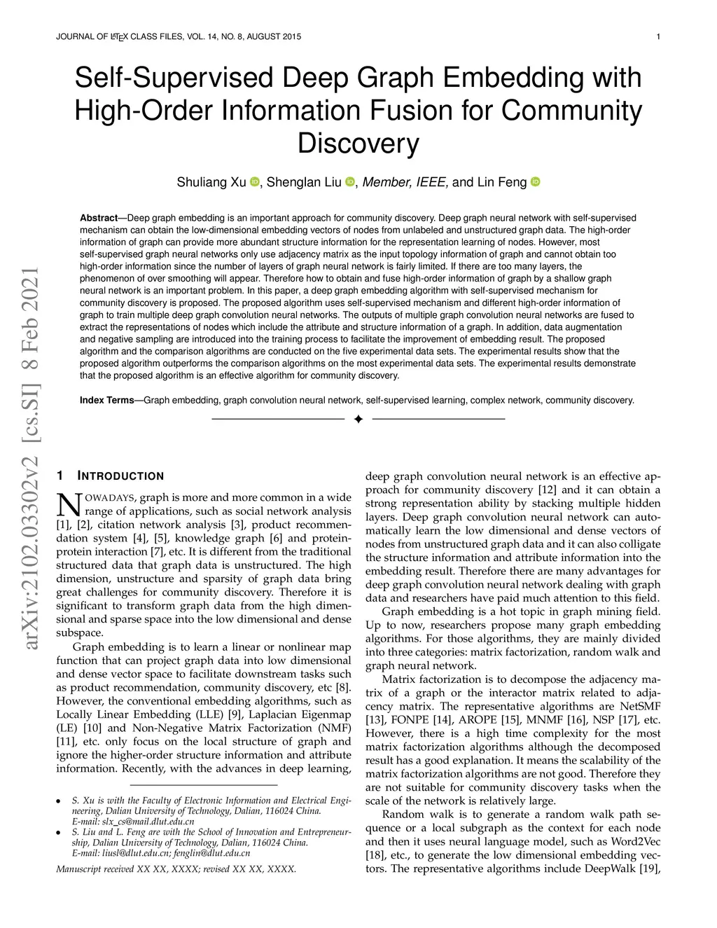 Deep graph embedding is an important approach for community discovery. Deep graph neural network with self-supervised mechanism can obtain the low-dimensional embedding vectors of nodes from unlabeled and unstructured graph data. The high-order information of graph can provide more abundant structure information for the representation learning of nodes. However, most self-supervised graph neural networks only use adjacency matrix as the input topology information of graph and cannot obtain too high-order information since the number of layers of graph neural network is fairly limited. If there are too many layers, the phenomenon of over smoothing will appear. Therefore how to obtain and fuse high-order information of graph by a shallow graph neural network is an important problem. In this paper, a deep graph embedding algorithm with self-supervised mechanism for community discovery is proposed. The proposed algorithm uses self-supervised mechanism and different high-order information of graph to train multiple deep graph convolution neural networks. The outputs of multiple graph convolution neural networks are fused to extract the representations of nodes which include the attribute and structure information of a graph. In addition, data augmentation and negative sampling are introduced into the training process to facilitate the improvement of embedding result. The proposed algorithm and the comparison algorithms are conducted on the five experimental data sets. The experimental results show that the proposed algorithm outperforms the comparison algorithms on the most experimental data sets. The experimental results demonstrate that the proposed algorithm is an effective algorithm for community discovery.