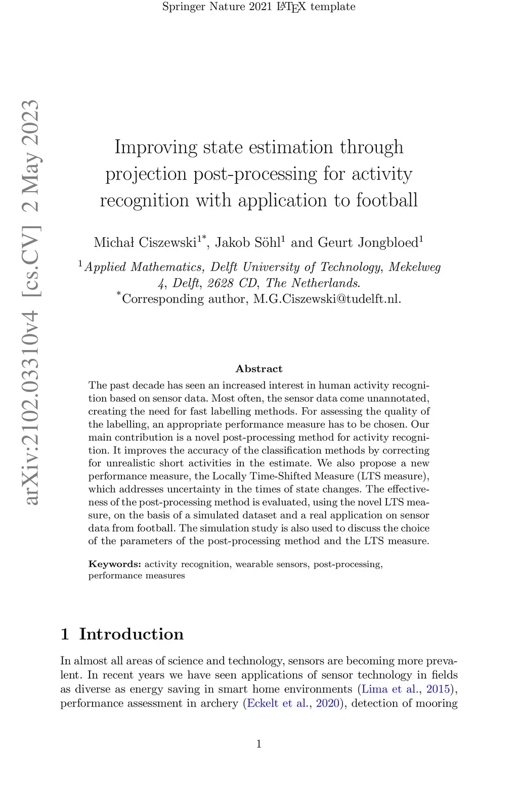 The past decade has seen an increased interest in human activity recognition based on sensor data. Most often, the sensor data come unannotated, creating the need for fast labelling methods. For assessing the quality of the labelling, an appropriate performance measure has to be chosen. Our main contribution is a novel post-processing method for activity recognition. It improves the accuracy of the classification methods by correcting for unrealistic short activities in the estimate. We also propose a new performance measure, the Locally Time-Shifted Measure (LTS measure), which addresses uncertainty in the times of state changes. The effectiveness of the post-processing method is evaluated, using the novel LTS measure, on the basis of a simulated dataset and a real application on sensor data from football. The simulation study is also used to discuss the choice of the parameters of the post-processing method and the LTS measure.