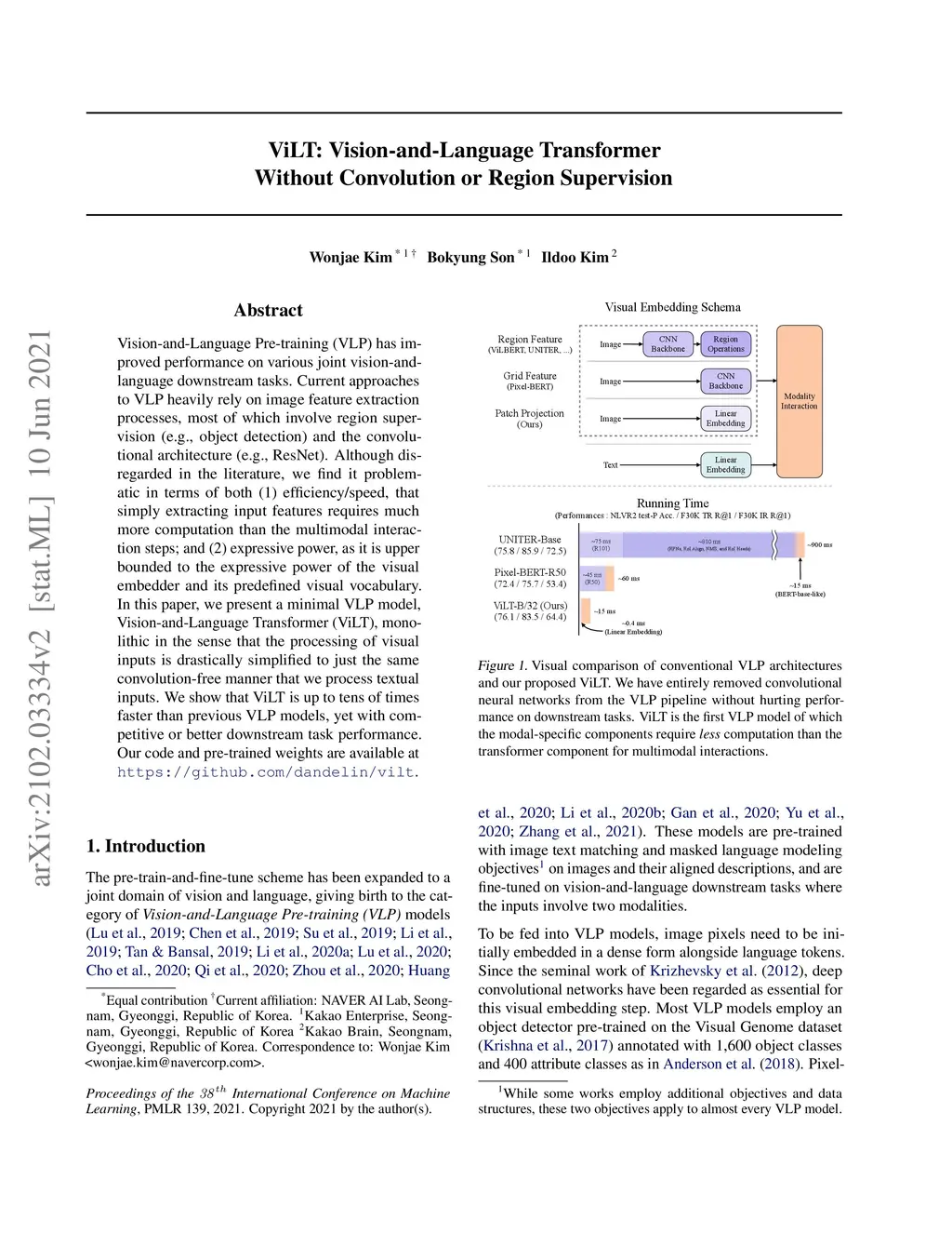 ViLT: Vision-and-Language Transformer Without Convolution or Region