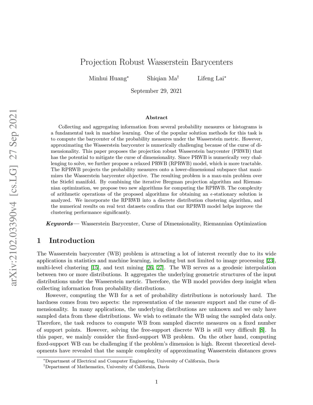 Collecting and aggregating information from several probability measures or histograms is a fundamental task in machine learning. One of the popular solution methods for this task is to compute the barycenter of the probability measures under the Wasserstein metric. However, approximating the Wasserstein barycenter is numerically challenging because of the curse of dimensionality. This paper proposes the projection robust Wasserstein barycenter (PRWB) that has the potential to mitigate the curse of dimensionality. Since PRWB is numerically very challenging to solve, we further propose a relaxed PRWB (RPRWB) model, which is more tractable. The RPRWB projects the probability measures onto a lower-dimensional subspace that maximizes the Wasserstein barycenter objective. The resulting problem is a max-min problem over the Stiefel manifold. By combining the iterative Bregman projection algorithm and Riemannian optimization, we propose two new algorithms for computing the RPRWB. The complexity of arithmetic operations of the proposed algorithms for obtaining an -stationary solution is analyzed. We incorporate the RPRWB into a discrete distribution clustering algorithm, and the numerical results on real text datasets confirm that our RPRWB model helps improve the clustering performance significantly.