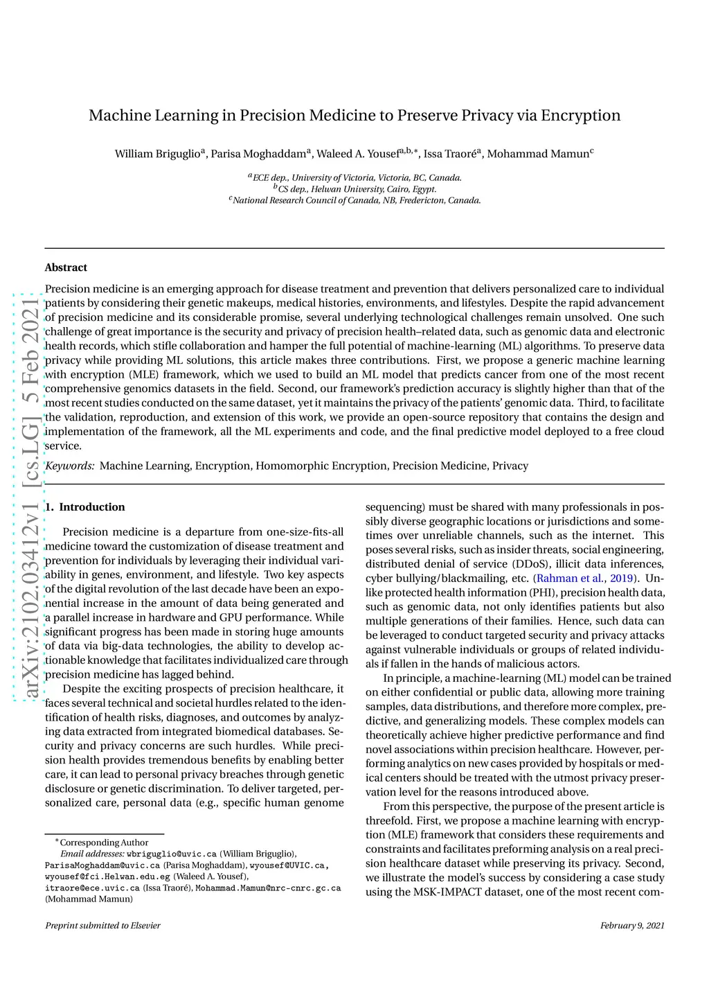 Precision medicine is an emerging approach for disease treatment and prevention that delivers personalized care to individual patients by considering their genetic makeups, medical histories, environments, and lifestyles. Despite the rapid advancement of precision medicine and its considerable promise, several underlying technological challenges remain unsolved. One such challenge of great importance is the security and privacy of precision health-related data, such as genomic data and electronic health records, which stifle collaboration and hamper the full potential of machine-learning (ML) algorithms. To preserve data privacy while providing ML solutions, this article makes three contributions. First, we propose a generic machine learning with encryption (MLE) framework, which we used to build an ML model that predicts cancer from one of the most recent comprehensive genomics datasets in the field. Second, our framework's prediction accuracy is slightly higher than that of the most recent studies conducted on the same dataset, yet it maintains the privacy of the patients' genomic data. Third, to facilitate the validation, reproduction, and extension of this work, we provide an open-source repository that contains the design and implementation of the framework, all the ML experiments and code, and the final predictive model deployed to a free cloud service.