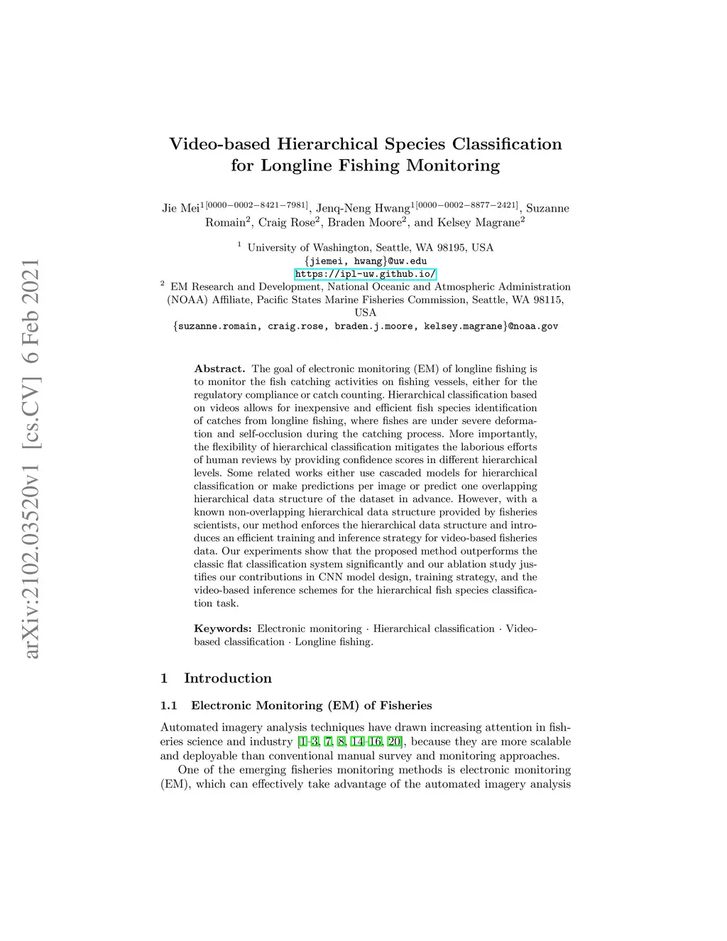 The goal of electronic monitoring (EM) of longline fishing is to monitor the fish catching activities on fishing vessels, either for the regulatory compliance or catch counting. Hierarchical classification based on videos allows for inexpensive and efficient fish species identification of catches from longline fishing, where fishes are under severe deformation and self-occlusion during the catching process. More importantly, the flexibility of hierarchical classification mitigates the laborious efforts of human reviews by providing confidence scores in different hierarchical levels. Some related works either use cascaded models for hierarchical classification or make predictions per image or predict one overlapping hierarchical data structure of the dataset in advance. However, with a known non-overlapping hierarchical data structure provided by fisheries scientists, our method enforces the hierarchical data structure and introduces an efficient training and inference strategy for video-based fisheries data. Our experiments show that the proposed method outperforms the classic flat classification system significantly and our ablation study justifies our contributions in CNN model design, training strategy, and the video-based inference schemes for the hierarchical fish species classification task.