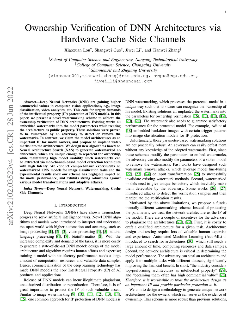 Ownership Verification of DNN Architectures via Hardware Cache Side