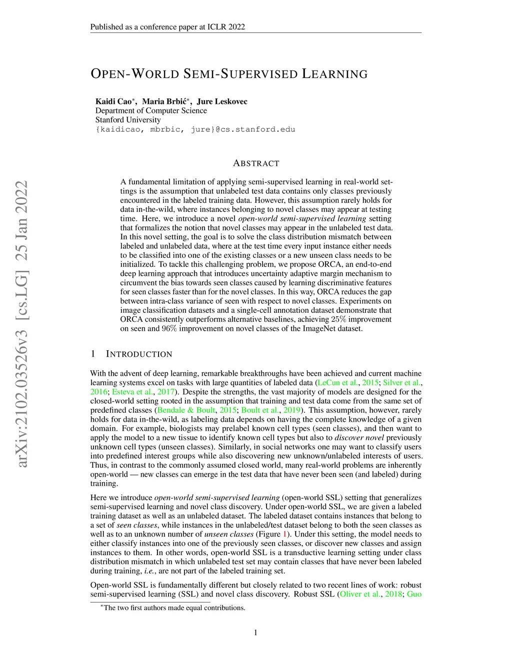 A fundamental limitation of applying semi-supervised learning in real-world settings is the assumption that unlabeled test data contains only classes previously encountered in the labeled training data. However, this assumption rarely holds for data in-the-wild, where instances belonging to novel classes may appear at testing time. Here, we introduce a novel open-world semi-supervised learning setting that formalizes the notion that novel classes may appear in the unlabeled test data. In this novel setting, the goal is to solve the class distribution mismatch between labeled and unlabeled data, where at the test time every input instance either needs to be classified into one of the existing classes or a new unseen class needs to be initialized. To tackle this challenging problem, we propose ORCA, an end-to-end deep learning approach that introduces uncertainty adaptive margin mechanism to circumvent the bias towards seen classes caused by learning discriminative features for seen classes faster than for the novel classes. In this way, ORCA reduces the gap between intra-class variance of seen with respect to novel classes. Experiments on image classification datasets and a single-cell annotation dataset demonstrate that ORCA consistently outperforms alternative baselines, achieving 25% improvement on seen and 96% improvement on novel classes of the ImageNet dataset.