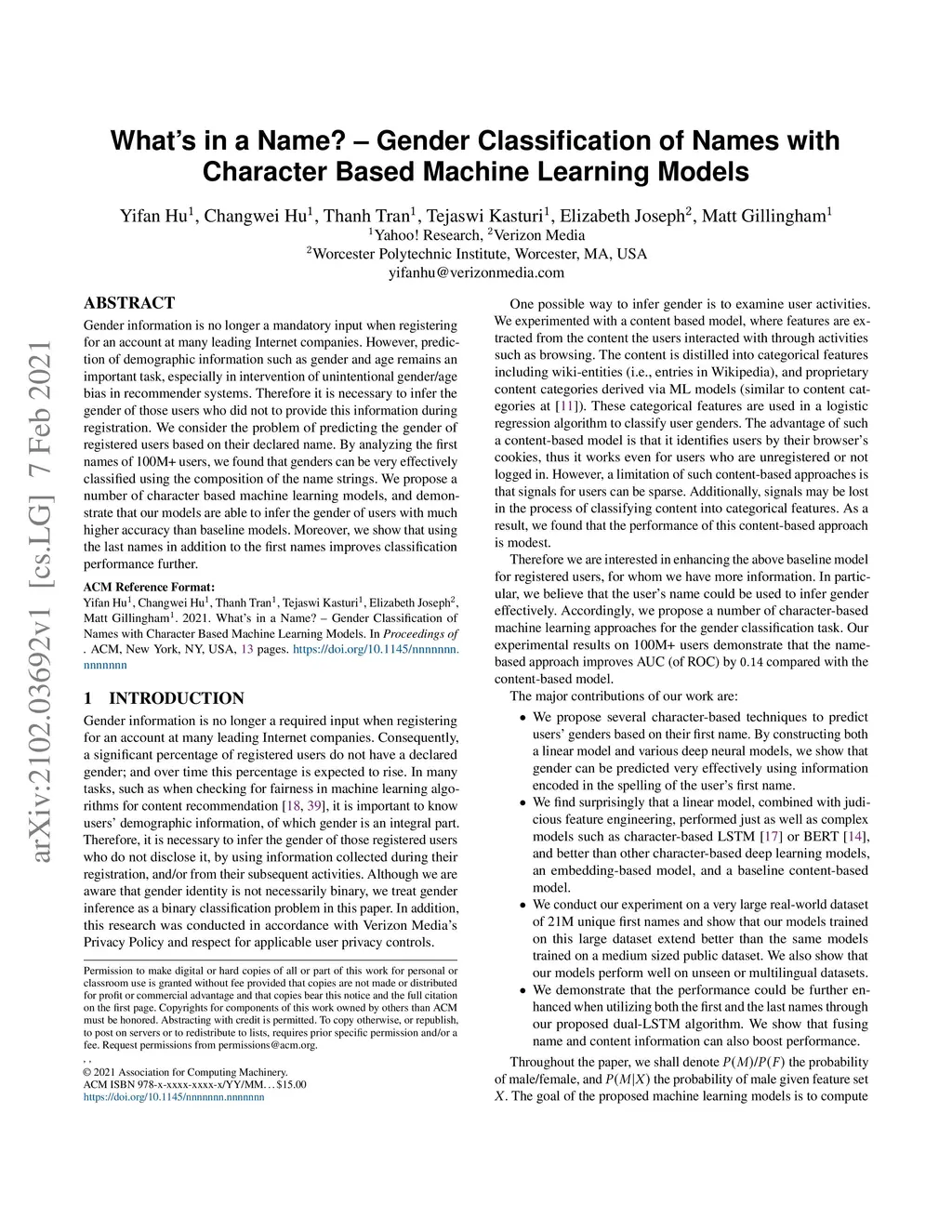 Gender information is no longer a mandatory input when registering for an account at many leading Internet companies. However, prediction of demographic information such as gender and age remains an important task, especially in intervention of unintentional gender/age bias in recommender systems. Therefore it is necessary to infer the gender of those users who did not to provide this information during registration. We consider the problem of predicting the gender of registered users based on their declared name. By analyzing the first names of 100M+ users, we found that genders can be very effectively classified using the composition of the name strings. We propose a number of character based machine learning models, and demonstrate that our models are able to infer the gender of users with much higher accuracy than baseline models. Moreover, we show that using the last names in addition to the first names improves classification performance further.