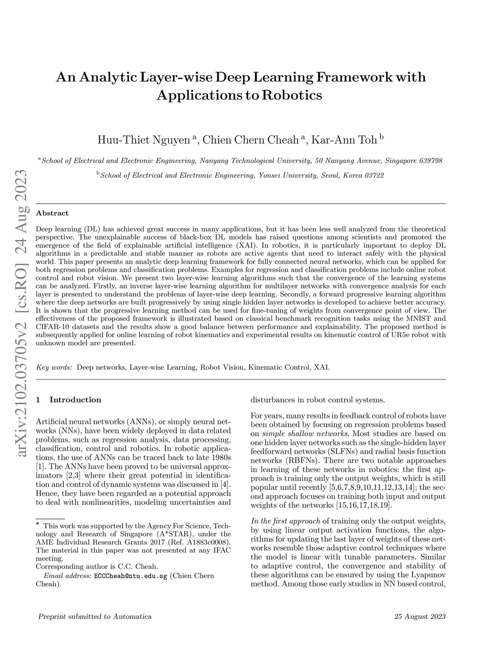 Deep learning (DL) has achieved great success in many applications, but it has been less well analyzed from the theoretical perspective. The unexplainable success of black-box DL models has raised questions among scientists and promoted the emergence of the field of explainable artificial intelligence (XAI). In robotics, it is particularly important to deploy DL algorithms in a predictable and stable manner as robots are active agents that need to interact safely with the physical world. This paper presents an analytic deep learning framework for fully connected neural networks, which can be applied for both regression problems and classification problems. Examples for regression and classification problems include online robot control and robot vision. We present two layer-wise learning algorithms such that the convergence of the learning systems can be analyzed. Firstly, an inverse layer-wise learning algorithm for multilayer networks with convergence analysis for each layer is presented to understand the problems of layer-wise deep learning. Secondly, a forward progressive learning algorithm where the deep networks are built progressively by using single hidden layer networks is developed to achieve better accuracy. It is shown that the progressive learning method can be used for fine-tuning of weights from convergence point of view. The effectiveness of the proposed framework is illustrated based on classical benchmark recognition tasks using the MNIST and CIFAR-10 datasets and the results show a good balance between performance and explainability. The proposed method is subsequently applied for online learning of robot kinematics and experimental results on kinematic control of UR5e robot with unknown model are presented.