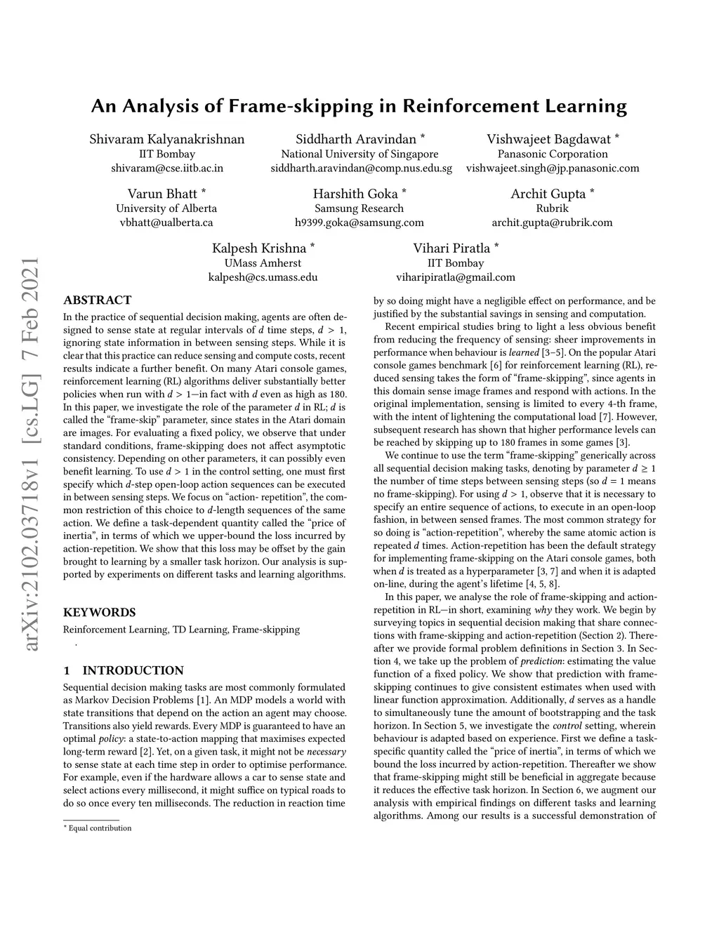 In the practice of sequential decision making, agents are often designed to sense state at regular intervals of time steps, , ignoring state information in between sensing steps. While it is clear that this practice can reduce sensing and compute costs, recent results indicate a further benefit. On many Atari console games, reinforcement learning (RL) algorithms deliver substantially better policies when run with -- in fact with even as high as . In this paper, we investigate the role of the parameter in RL; is called the "frame-skip" parameter, since states in the Atari domain are images. For evaluating a fixed policy, we observe that under standard conditions, frame-skipping does not affect asymptotic consistency. Depending on other parameters, it can possibly even benefit learning. To use in the control setting, one must first specify which -step open-loop action sequences can be executed in between sensing steps. We focus on "action-repetition", the common restriction of this choice to -length sequences of the same action. We define a task-dependent quantity called the "price of inertia", in terms of which we upper-bound the loss incurred by action-repetition. We show that this loss may be offset by the gain brought to learning by a smaller task horizon. Our analysis is supported by experiments on different tasks and learning algorithms.