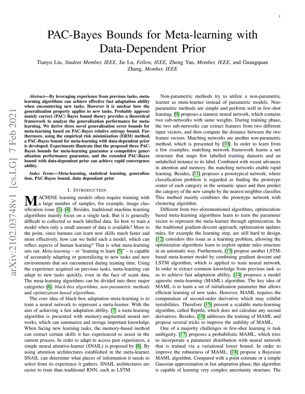 By leveraging experience from previous tasks, meta-learning algorithms can achieve effective fast adaptation ability when encountering new tasks. However it is unclear how the generalization property applies to new tasks. Probably approximately correct (PAC) Bayes bound theory provides a theoretical framework to analyze the generalization performance for meta-learning. We derive three novel generalisation error bounds for meta-learning based on PAC-Bayes relative entropy bound. Furthermore, using the empirical risk minimization (ERM) method, a PAC-Bayes bound for meta-learning with data-dependent prior is developed. Experiments illustrate that the proposed three PAC-Bayes bounds for meta-learning guarantee a competitive generalization performance guarantee, and the extended PAC-Bayes bound with data-dependent prior can achieve rapid convergence ability.