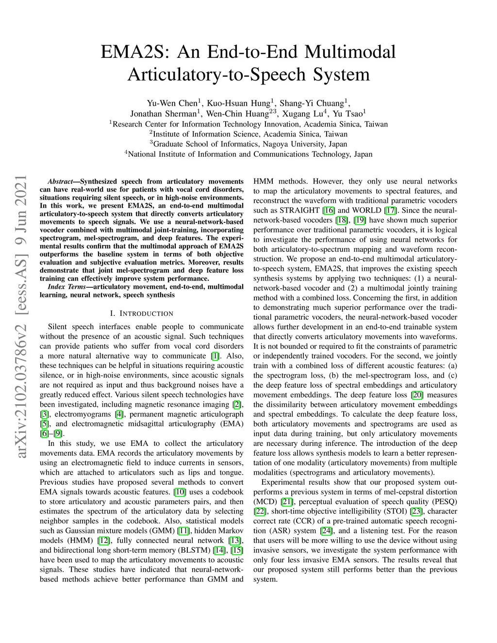 EMA2S: An End-to-End Multimodal Articulatory-to-Speech System