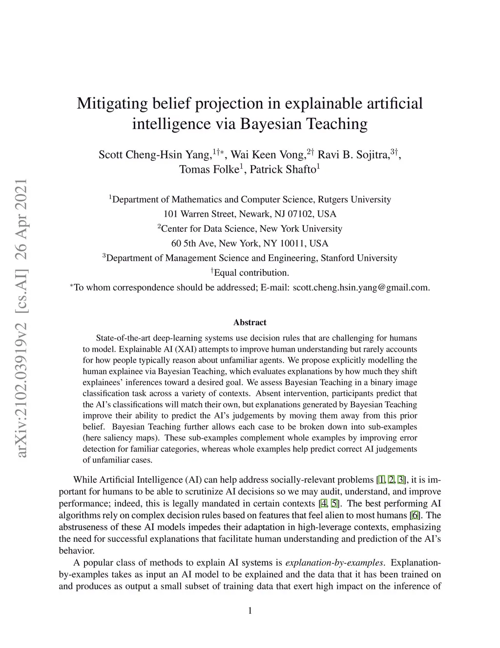 State-of-the-art deep-learning systems use decision rules that are challenging for humans to model. Explainable AI (XAI) attempts to improve human understanding but rarely accounts for how people typically reason about unfamiliar agents. We propose explicitly modeling the human explainee via Bayesian Teaching, which evaluates explanations by how much they shift explainees' inferences toward a desired goal. We assess Bayesian Teaching in a binary image classification task across a variety of contexts. Absent intervention, participants predict that the AI's classifications will match their own, but explanations generated by Bayesian Teaching improve their ability to predict the AI's judgements by moving them away from this prior belief. Bayesian Teaching further allows each case to be broken down into sub-examples (here saliency maps). These sub-examples complement whole examples by improving error detection for familiar categories, whereas whole examples help predict correct AI judgements of unfamiliar cases.