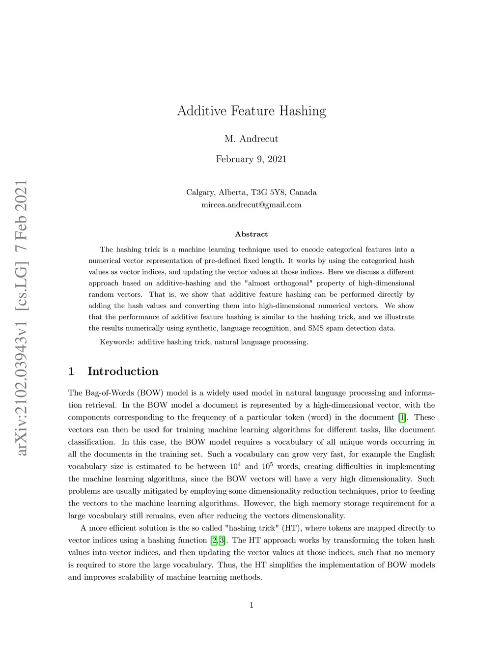 The hashing trick is a machine learning technique used to encode categorical features into a numerical vector representation of pre-defined fixed length. It works by using the categorical hash values as vector indices, and updating the vector values at those indices. Here we discuss a different approach based on additive-hashing and the "almost orthogonal" property of high-dimensional random vectors. That is, we show that additive feature hashing can be performed directly by adding the hash values and converting them into high-dimensional numerical vectors. We show that the performance of additive feature hashing is similar to the hashing trick, and we illustrate the results numerically using synthetic, language recognition, and SMS spam detection data.