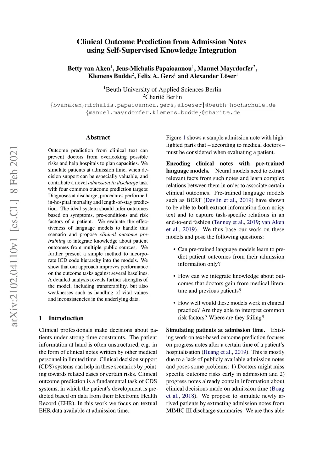 Clinical Outcome Prediction from Admission Notes using Self-Supervised