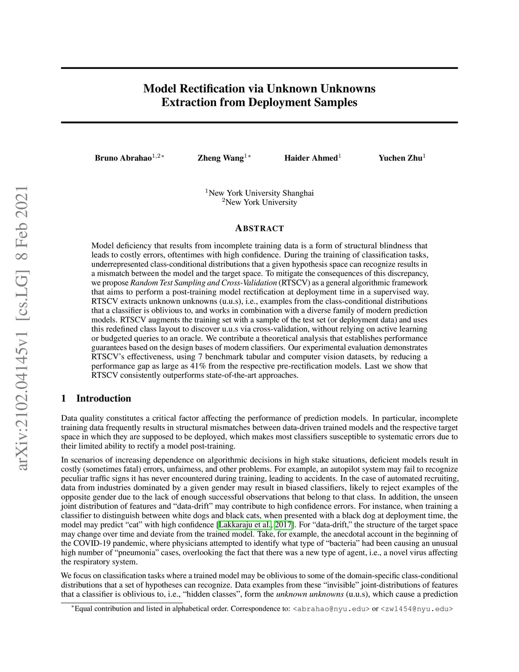 Model deficiency that results from incomplete training data is a form of structural blindness that leads to costly errors, oftentimes with high confidence. During the training of classification tasks, underrepresented class-conditional distributions that a given hypothesis space can recognize results in a mismatch between the model and the target space. To mitigate the consequences of this discrepancy, we propose Random Test Sampling and Cross-Validation (RTSCV) as a general algorithmic framework that aims to perform a post-training model rectification at deployment time in a supervised way. RTSCV extracts unknown unknowns (u.u.s), i.e., examples from the class-conditional distributions that a classifier is oblivious to, and works in combination with a diverse family of modern prediction models. RTSCV augments the training set with a sample of the test set (or deployment data) and uses this redefined class layout to discover u.u.s via cross-validation, without relying on active learning or budgeted queries to an oracle. We contribute a theoretical analysis that establishes performance guarantees based on the design bases of modern classifiers. Our experimental evaluation demonstrates RTSCV's effectiveness, using 7 benchmark tabular and computer vision datasets, by reducing a performance gap as large as 41% from the respective pre-rectification models. Last we show that RTSCV consistently outperforms state-of-the-art approaches.