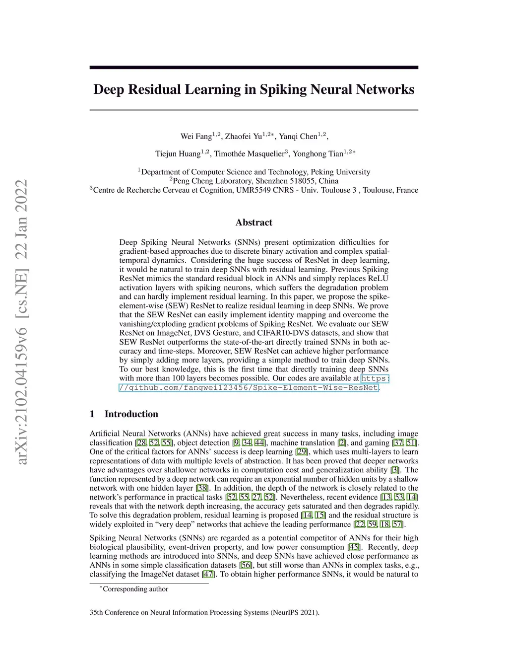 Deep Residual Learning in Spiking Neural Networks
