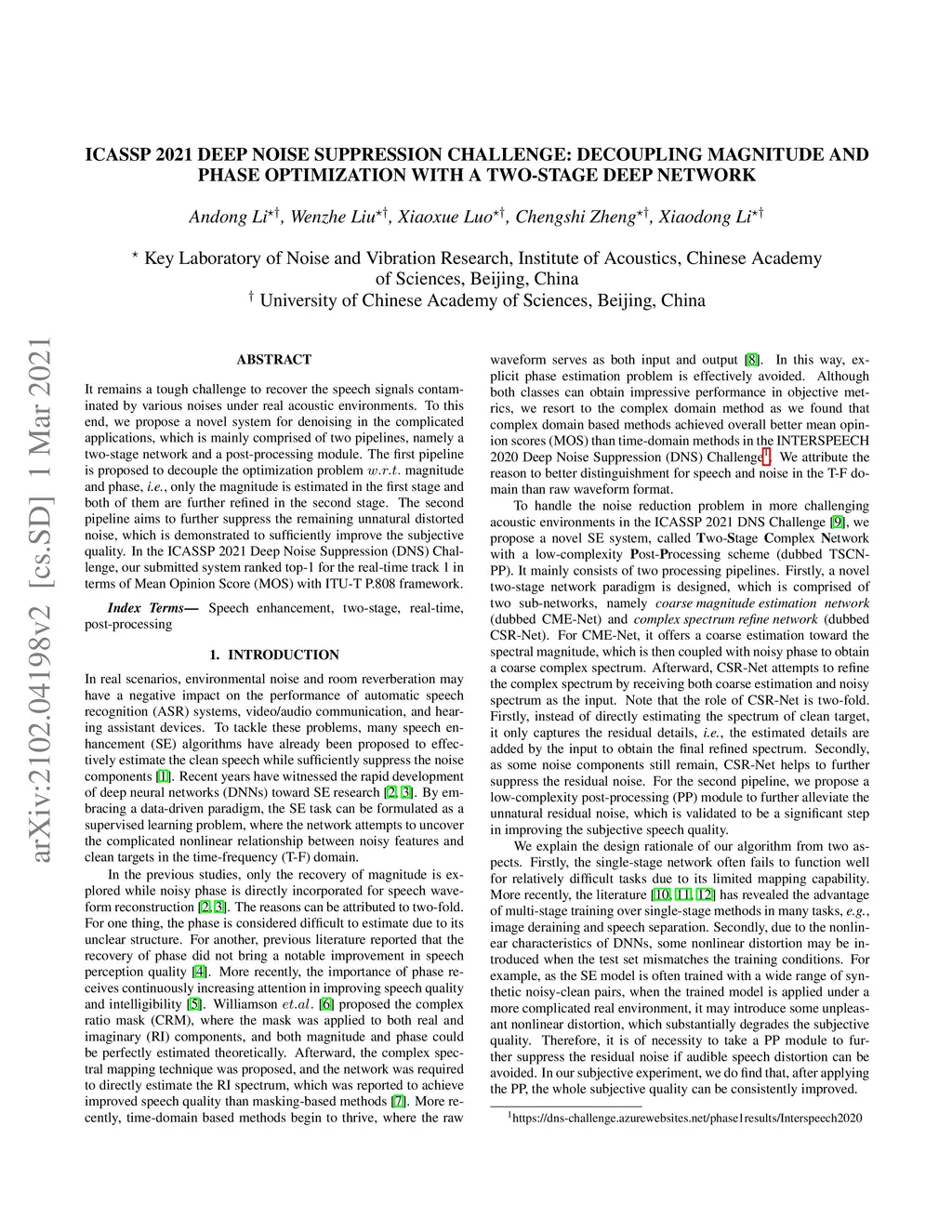 It remains a tough challenge to recover the speech signals contaminated by various noises under real acoustic environments. To this end, we propose a novel system for denoising in the complicated applications, which is mainly comprised of two pipelines, namely a two-stage network and a post-processing module. The first pipeline is proposed to decouple the optimization problem w:r:t: magnitude and phase, i.e., only the magnitude is estimated in the first stage and both of them are further refined in the second stage. The second pipeline aims to further suppress the remaining unnatural distorted noise, which is demonstrated to sufficiently improve the subjective quality. In the ICASSP 2021 Deep Noise Suppression (DNS) Challenge, our submitted system ranked top-1 for the real-time track 1 in terms of Mean Opinion Score (MOS) with ITU-T P.808 framework.