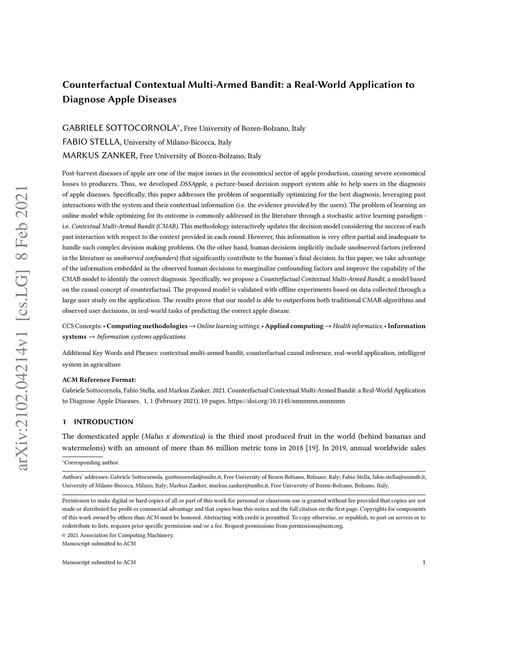 Post-harvest diseases of apple are one of the major issues in the economical sector of apple production, causing severe economical losses to producers. Thus, we developed DSSApple, a picture-based decision support system able to help users in the diagnosis of apple diseases. Specifically, this paper addresses the problem of sequentially optimizing for the best diagnosis, leveraging past interactions with the system and their contextual information (i.e. the evidence provided by the users). The problem of learning an online model while optimizing for its outcome is commonly addressed in the literature through a stochastic active learning paradigm - i.e. Contextual Multi-Armed Bandit (CMAB). This methodology interactively updates the decision model considering the success of each past interaction with respect to the context provided in each round. However, this information is very often partial and inadequate to handle such complex decision making problems. On the other hand, human decisions implicitly include unobserved factors (referred in the literature as unobserved confounders) that significantly contribute to the human's final decision. In this paper, we take advantage of the information embedded in the observed human decisions to marginalize confounding factors and improve the capability of the CMAB model to identify the correct diagnosis. Specifically, we propose a Counterfactual Contextual Multi-Armed Bandit, a model based on the causal concept of counterfactual. The proposed model is validated with offline experiments based on data collected through a large user study on the application. The results prove that our model is able to outperform both traditional CMAB algorithms and observed user decisions, in real-world tasks of predicting the correct apple disease.
