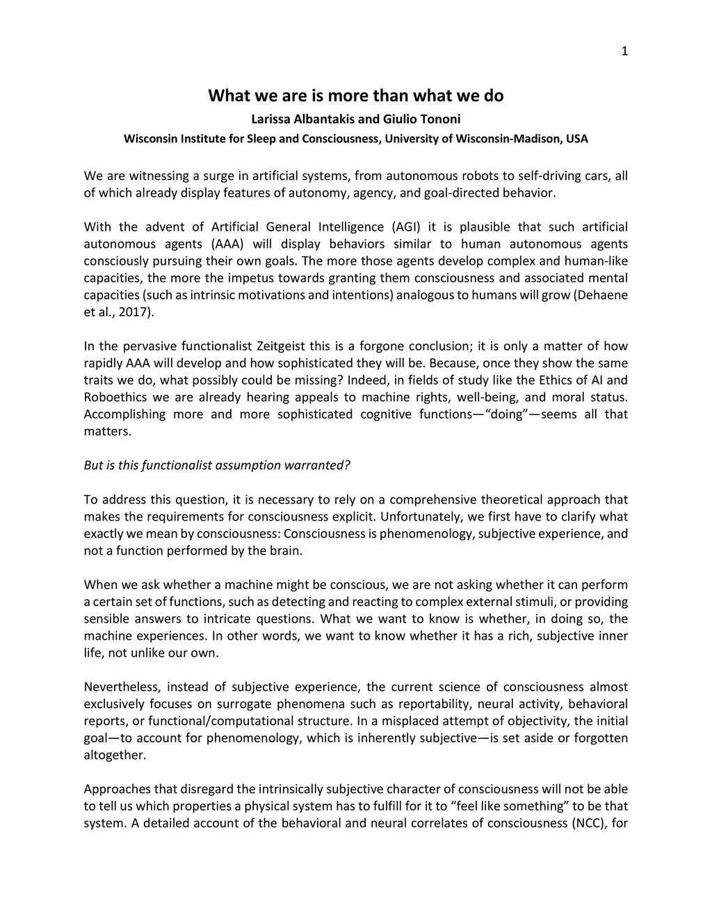 If we take the subjective character of consciousness seriously, consciousness becomes a matter of "being" rather than "doing". Because "doing" can be dissociated from "being", functional criteria alone are insufficient to decide whether a system possesses the necessary requirements for being a physical substrate of consciousness. The dissociation between "being" and "doing" is most salient in artificial general intelligence, which may soon replicate any human capacity: computers can perform complex functions (in the limit resembling human behavior) in the absence of consciousness. Complex behavior becomes meaningless if it is not performed by a conscious being.