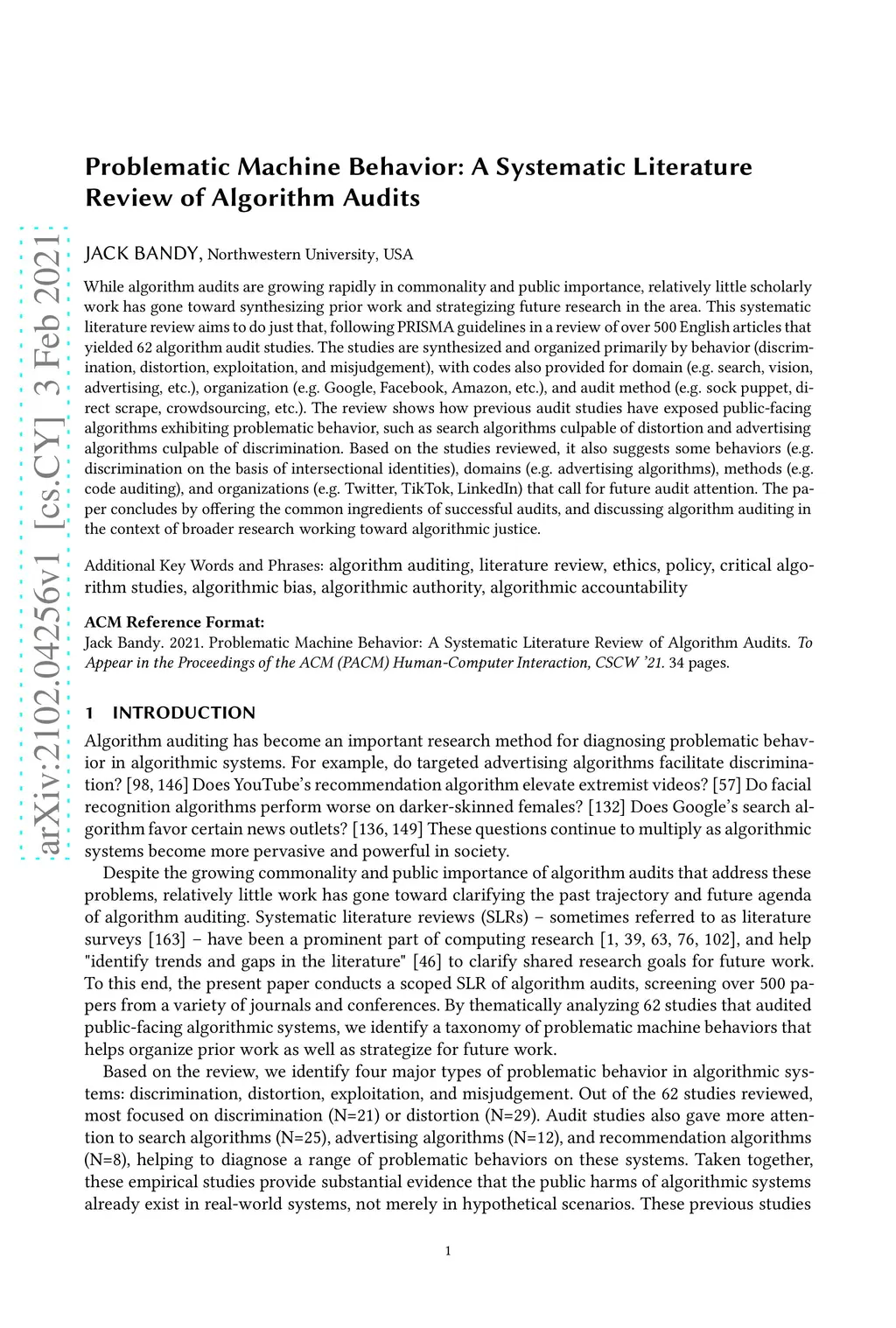 While algorithm audits are growing rapidly in commonality and public importance, relatively little scholarly work has gone toward synthesizing prior work and strategizing future research in the area. This systematic literature review aims to do just that, following PRISMA guidelines in a review of over 500 English articles that yielded 62 algorithm audit studies. The studies are synthesized and organized primarily by behavior (discrimination, distortion, exploitation, and misjudgement), with codes also provided for domain (e.g. search, vision, advertising, etc.), organization (e.g. Google, Facebook, Amazon, etc.), and audit method (e.g. sock puppet, direct scrape, crowdsourcing, etc.). The review shows how previous audit studies have exposed public-facing algorithms exhibiting problematic behavior, such as search algorithms culpable of distortion and advertising algorithms culpable of discrimination. Based on the studies reviewed, it also suggests some behaviors (e.g. discrimination on the basis of intersectional identities), domains (e.g. advertising algorithms), methods (e.g. code auditing), and organizations (e.g. Twitter, TikTok, LinkedIn) that call for future audit attention. The paper concludes by offering the common ingredients of successful audits, and discussing algorithm auditing in the context of broader research working toward algorithmic justice.