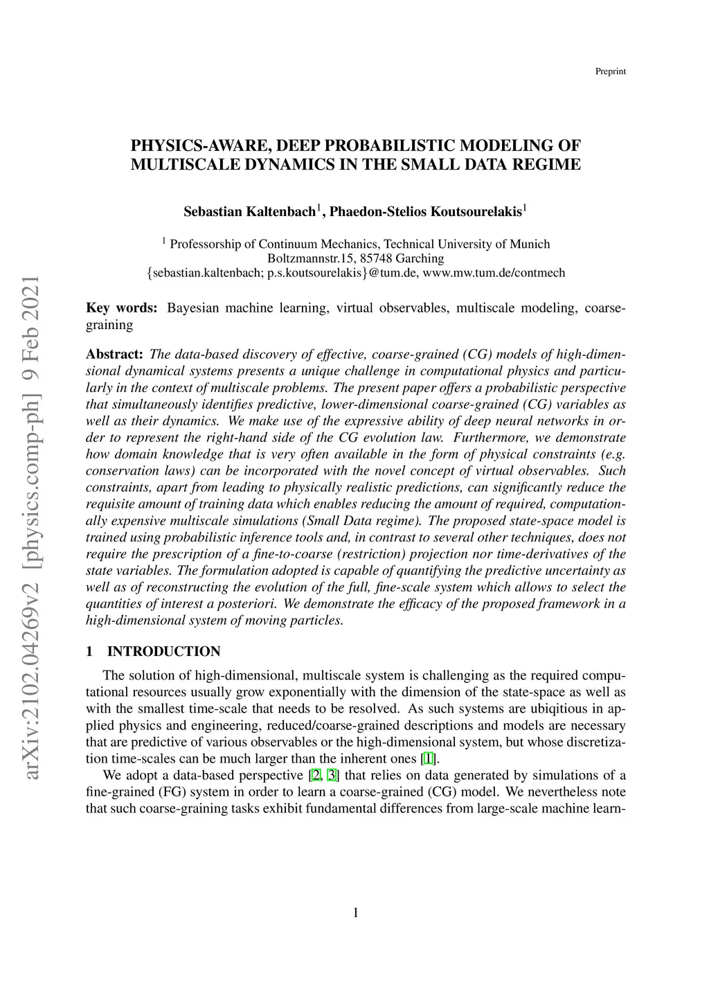 The data-based discovery of effective, coarse-grained (CG) models of high-dimensional dynamical systems presents a unique challenge in computational physics and particularly in the context of multiscale problems. The present paper offers a probabilistic perspective that simultaneously identifies predictive, lower-dimensional coarse-grained (CG) variables as well as their dynamics. We make use of the expressive ability of deep neural networks in order to represent the right-hand side of the CG evolution law. Furthermore, we demonstrate how domain knowledge that is very often available in the form of physical constraints (e.g. conservation laws) can be incorporated with the novel concept of virtual observables. Such constraints, apart from leading to physically realistic predictions, can significantly reduce the requisite amount of training data which enables reducing the amount of required, computationally expensive multiscale simulations (Small Data regime). The proposed state-space model is trained using probabilistic inference tools and, in contrast to several other techniques, does not require the prescription of a fine-to-coarse (restriction) projection nor time-derivatives of the state variables. The formulation adopted is capable of quantifying the predictive uncertainty as well as of reconstructing the evolution of the full, fine-scale system which allows to select the quantities of interest a posteriori. We demonstrate the efficacy of the proposed framework in a high-dimensional system of moving particles.