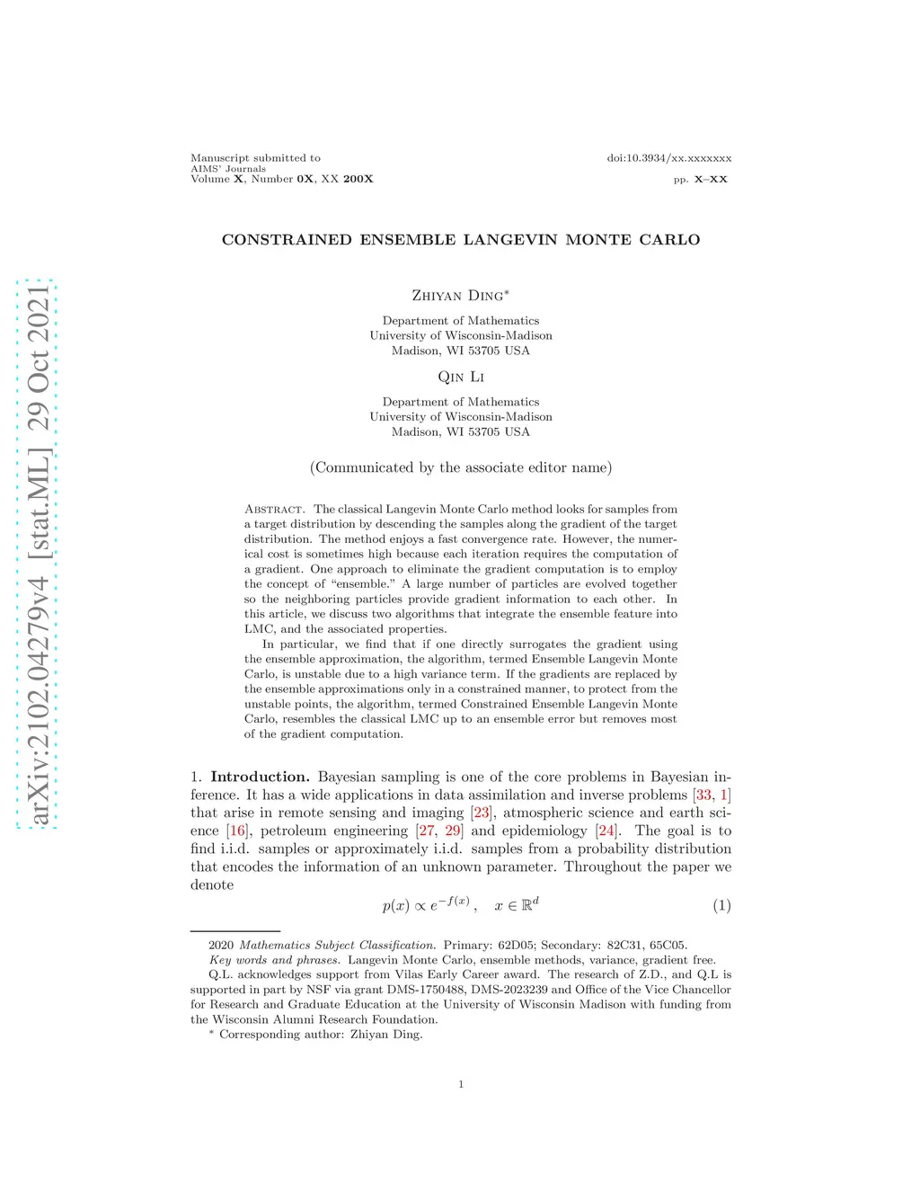 The classical Langevin Monte Carlo method looks for samples from a target distribution by descending the samples along the gradient of the target distribution. The method enjoys a fast convergence rate. However, the numerical cost is sometimes high because each iteration requires the computation of a gradient. One approach to eliminate the gradient computation is to employ the concept of ``ensemble." A large number of particles are evolved together so the neighboring particles provide gradient information to each other. In this article, we discuss two algorithms that integrate the ensemble feature into LMC and the associated properties. In particular, we find that if one directly surrogates the gradient using the ensemble approximation, the algorithm, termed Ensemble Langevin Monte Carlo, is unstable due to a high variance term. If the gradients are replaced by the ensemble approximations only in a constrained manner, to protect from the unstable points, the algorithm, termed Constrained Ensemble Langevin Monte Carlo, resembles the classical LMC up to an ensemble error but removes most of the gradient computation.