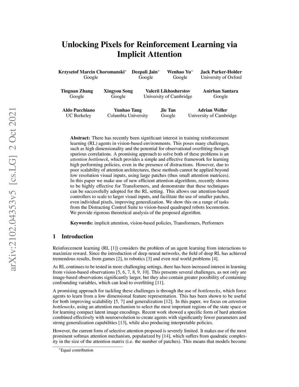 There has recently been significant interest in training reinforcement learning (RL) agents in vision-based environments. This poses many challenges, such as high dimensionality and potential for observational overfitting through spurious correlations. A promising approach to solve both of these problems is a self-attention bottleneck, which provides a simple and effective framework for learning high performing policies, even in the presence of distractions. However, due to poor scalability of attention architectures, these methods do not scale beyond low resolution visual inputs, using large patches (thus small attention matrices). In this paper we make use of new efficient attention algorithms, recently shown to be highly effective for Transformers, and demonstrate that these new techniques can be applied in the RL setting. This allows our attention-based controllers to scale to larger visual inputs, and facilitate the use of smaller patches, even individual pixels, improving generalization. In addition, we propose a new efficient algorithm approximating softmax attention with what we call hybrid random features, leveraging the theory of angular kernels. We show theoretically and empirically that hybrid random features is a promising approach when using attention for vision-based RL.