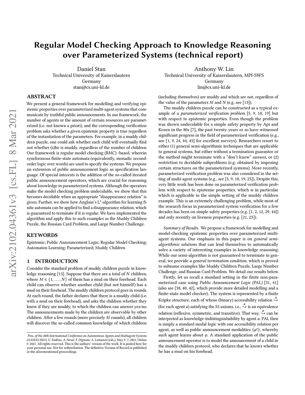 We present a general framework for modelling and verifying epistemic properties over parameterized multi-agent systems that communicate by truthful public announcements. In our framework, the number of agents or the amount of certain resources are parameterized (i.e. not known a priori), and the corresponding verification problem asks whether a given epistemic property is true regardless of the instantiation of the parameters. For example, in a muddy children puzzle, one could ask whether each child will eventually find out whether (s)he is muddy, regardless of the number of children. Our framework is regular model checking (RMC)-based, wherein synchronous finite-state automata (equivalently, monadic second-order logic over words) are used to specify the systems. We propose an extension of public announcement logic as specification language. Of special interests is the addition of the so-called iterated public announcement operators, which are crucial for reasoning about knowledge in parameterized systems. Although the operators make the model checking problem undecidable, we show that this becomes decidable when an appropriate "disappearance relation" is given. Further, we show how Angluin's L*-algorithm for learning finite automata can be applied to find a disappearance relation, which is guaranteed to terminate if it is regular. We have implemented the algorithm and apply this to such examples as the Muddy Children Puzzle, the Russian Card Problem, and Large Number Challenge.