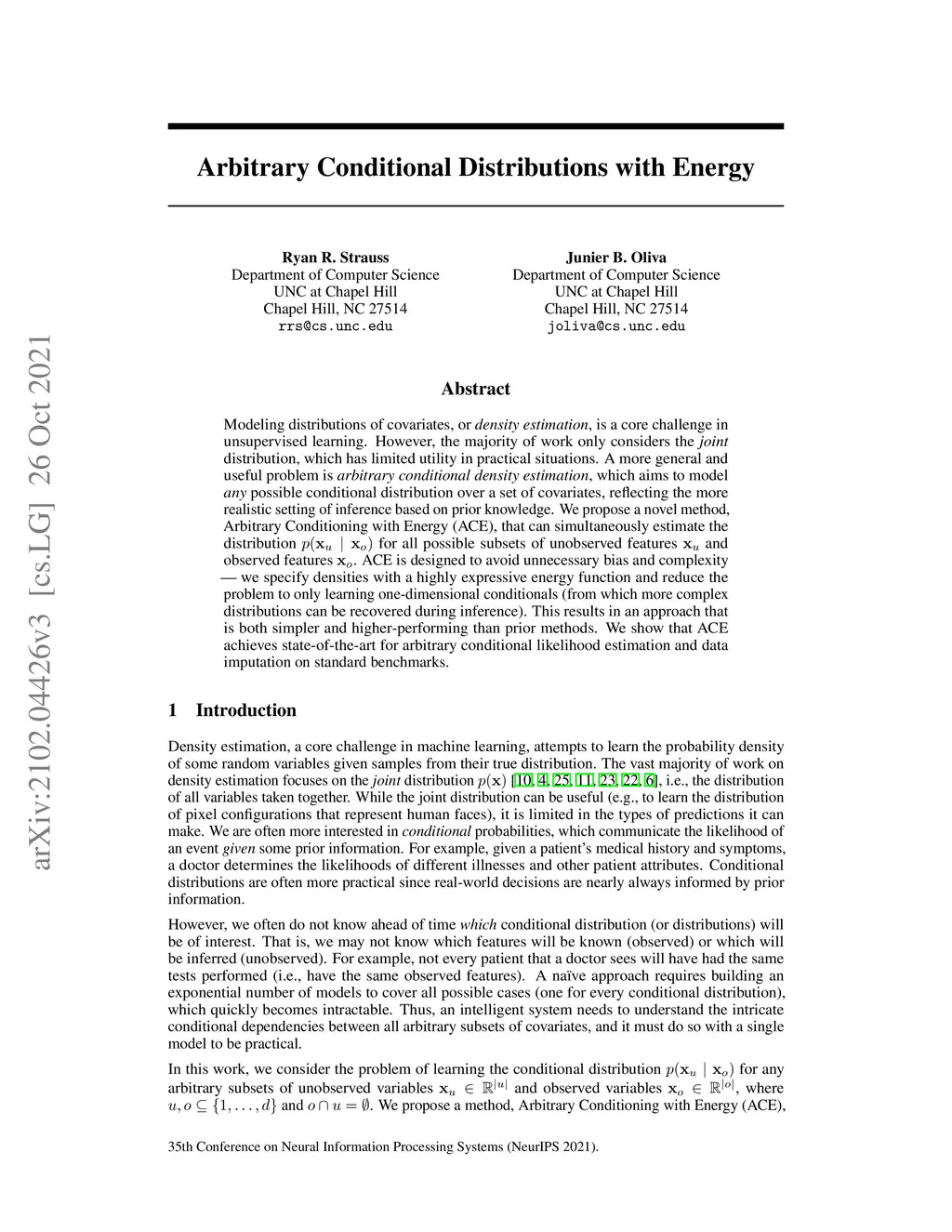 Modeling distributions of covariates, or density estimation, is a core challenge in unsupervised learning. However, the majority of work only considers the joint distribution, which has limited relevance to practical situations. A more general and useful problem is arbitrary conditional density estimation, which aims to model any possible conditional distribution over a set of covariates, reflecting the more realistic setting of inference based on prior knowledge. We propose a novel method, Arbitrary Conditioning with Energy (ACE), that can simultaneously estimate the distribution for all possible subsets of features and . ACE uses an energy function to specify densities, bypassing the architectural restrictions imposed by alternative methods and the biases imposed by tractable parametric distributions. We also simplify the learning problem by only learning one-dimensional conditionals, from which more complex distributions can be recovered during inference. Empirically, we show that ACE achieves state-of-the-art for arbitrary conditional and marginal likelihood estimation and for tabular data imputation.