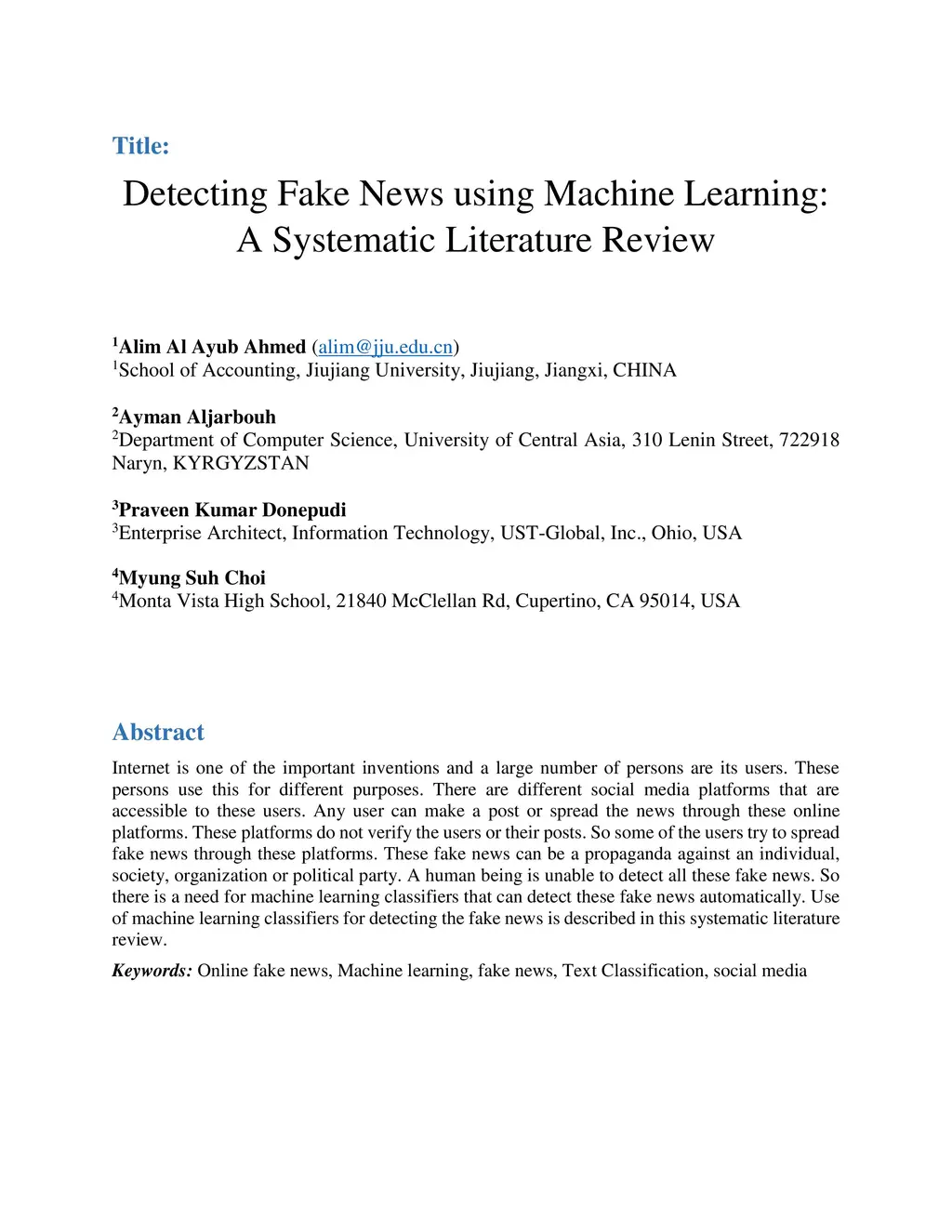 Internet is one of the important inventions and a large number of persons are its users. These persons use this for different purposes. There are different social media platforms that are accessible to these users. Any user can make a post or spread the news through the online platforms. These platforms do not verify the users or their posts. So some of the users try to spread fake news through these platforms. These news can be propaganda against an individual, society, organization or political party. A human being is unable to detect all these fake news. So there is a need for machine learning classifiers that can detect these fake news automatically. Use of machine learning classifiers for detecting fake news is described in this systematic literature review.