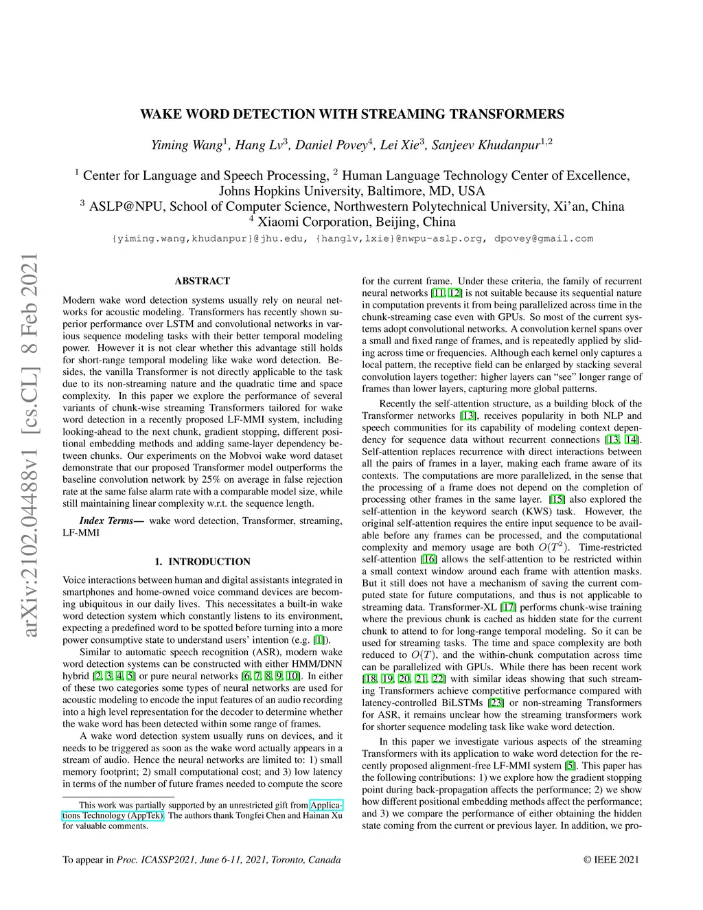 Modern wake word detection systems usually rely on neural networks for acoustic modeling. Transformers has recently shown superior performance over LSTM and convolutional networks in various sequence modeling tasks with their better temporal modeling power. However it is not clear whether this advantage still holds for short-range temporal modeling like wake word detection. Besides, the vanilla Transformer is not directly applicable to the task due to its non-streaming nature and the quadratic time and space complexity. In this paper we explore the performance of several variants of chunk-wise streaming Transformers tailored for wake word detection in a recently proposed LF-MMI system, including looking-ahead to the next chunk, gradient stopping, different positional embedding methods and adding same-layer dependency between chunks. Our experiments on the Mobvoi wake word dataset demonstrate that our proposed Transformer model outperforms the baseline convolution network by 25% on average in false rejection rate at the same false alarm rate with a comparable model size, while still maintaining linear complexity w.r.t. the sequence length.